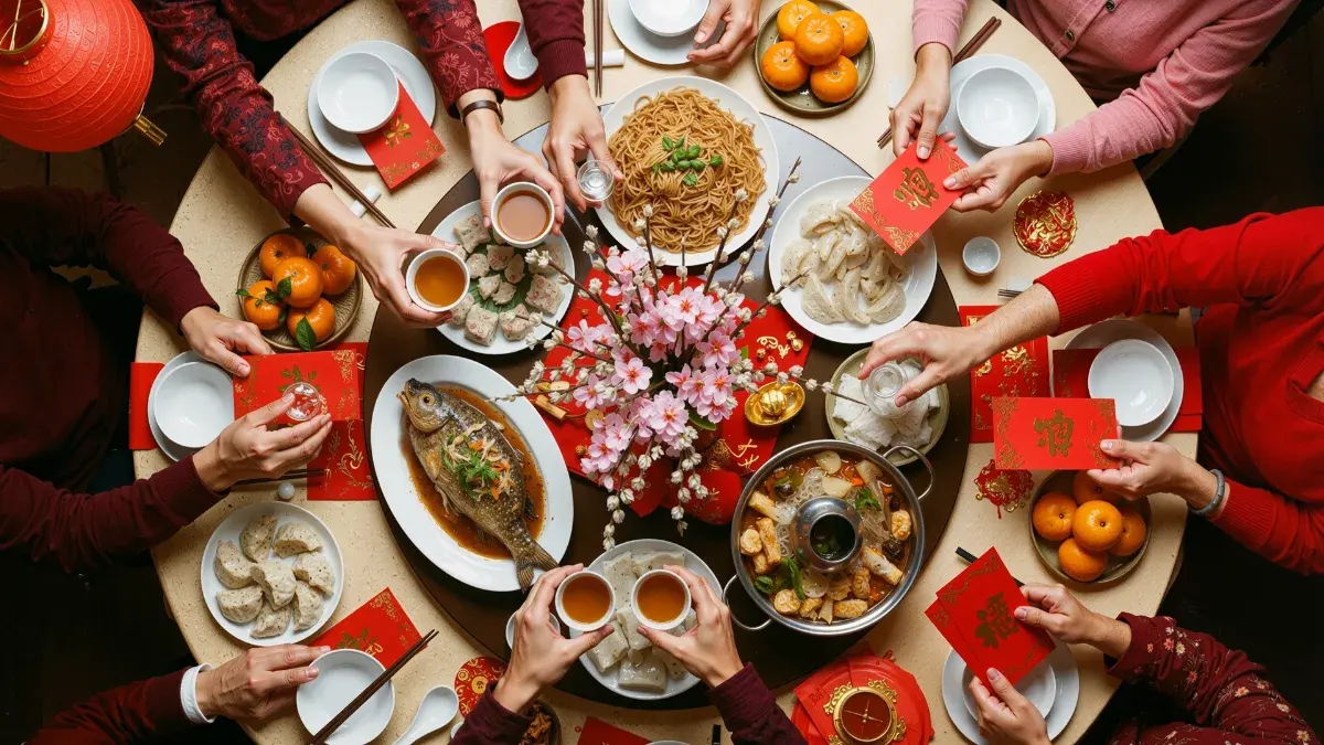 ร่วมโต๊ะอาหารกับครอบครัวและเลือกเมนูที่มีความหมายดี เช่น ปลา (เหลือกินเหลือใช้), ส้ม (สิริมงคล), หรือ บะหมี่ (อายุยืนยาว) เพื่อเป็นการรับพลังงานแห่งความสมบูรณ์พูนสุขเข้าสู่ร่างกาย
