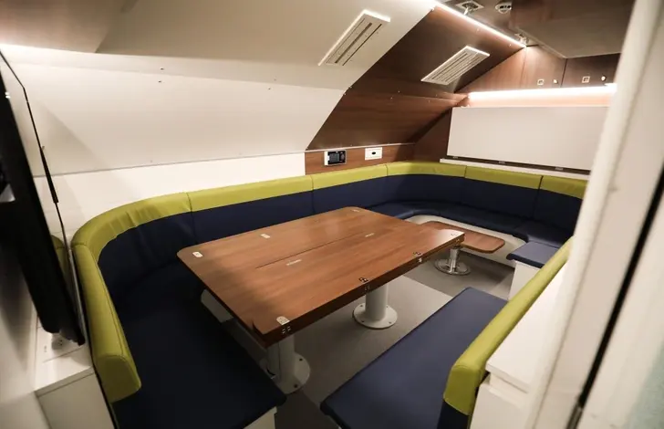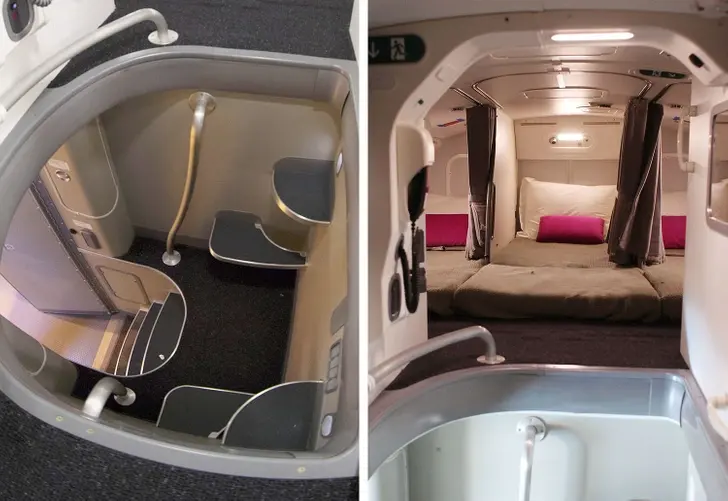 ตรงนี้เป็นจุดที่นักบินและพนักงานต้อนรับบนเครื่องบินนอนหลับ ในเที่ยวบินระหว่างประเทศที่ยาวนาน บนเครื่องโบอิ้ง 787 ดรีมไลเนอร์นี้ ส่วนนี้จะตั้งอยู่ด้านบนเหนือชั้นสำหรับผู้โดยสาร