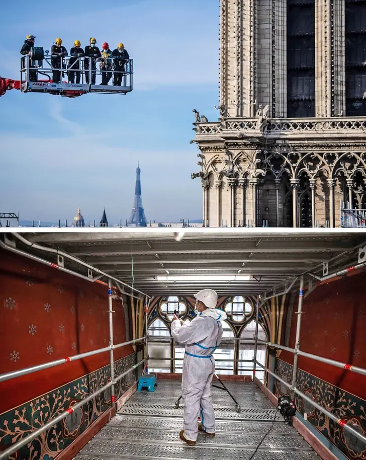 8. การเข้าไปยังส่วนที่กำลังปรับปรุงใหม่ของมหาวิหารนอเทรอดาม กรุงปารีส จากบนเครนเป็นเรื่องที่เป็นไปได้ยากมาก