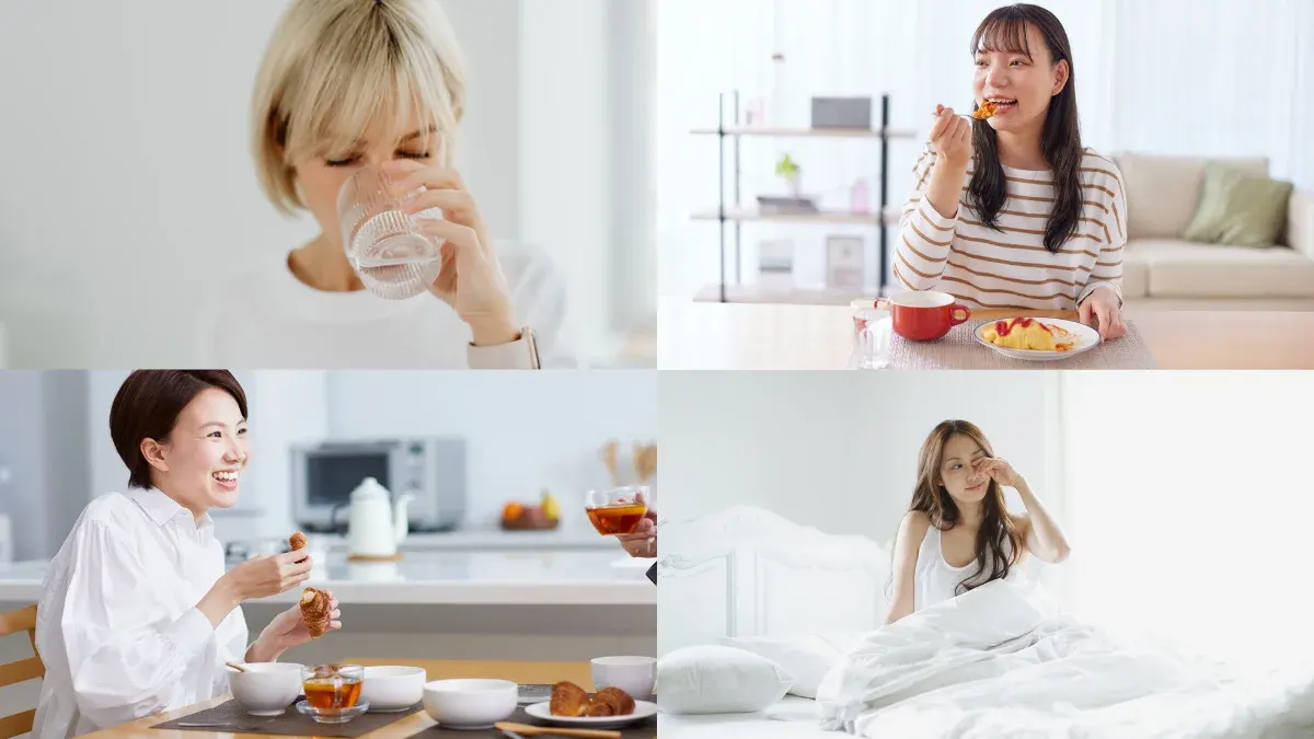 1.หลังตื่นนอน ไม่ควรดื่ม ชา กาแฟ เป็นมื้อแรก เพราะทำให้ฮอร์โมนเสียสมดุลได้ น้ำตาลอาจตกในระหว่างวัน ทำให้หิวบ่อย และ ทำให้ฮอร์โมนที่ควบคุมเรื่องน้ำตาลทำงานผิดปกติ (Insulin) ควรดื่มน้ำเปล่า 1 แก้ว ทันทีที่ตื่นนอน เพื่อช่วยเติมน้ำให้ร่างกายที่สูญเสียไประหว่างการนอนหลับ