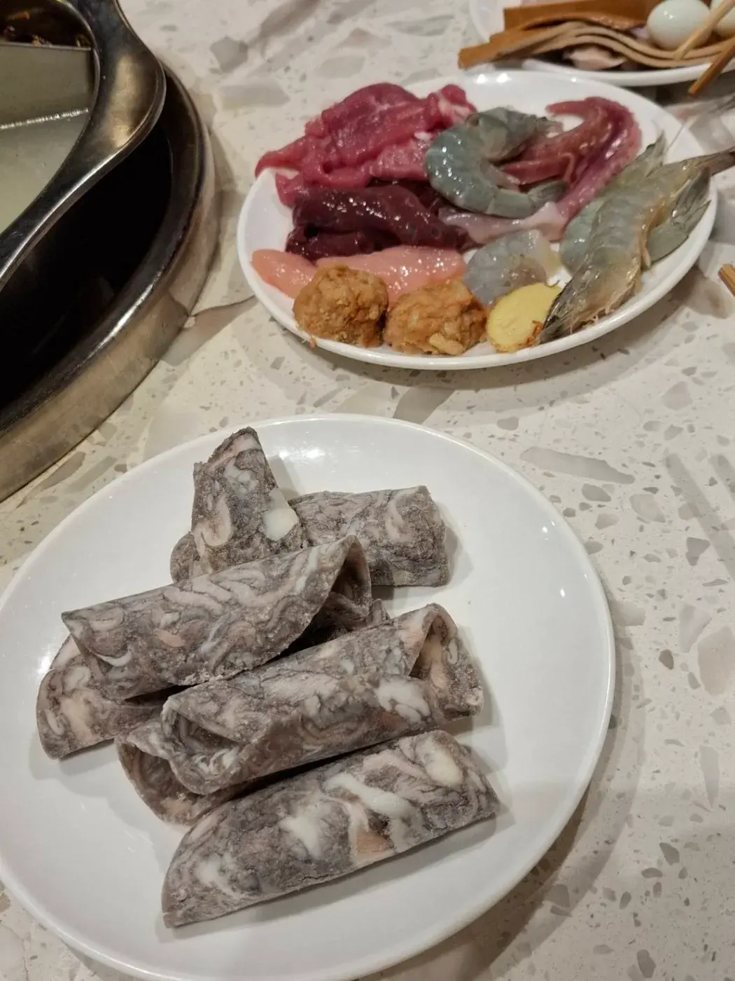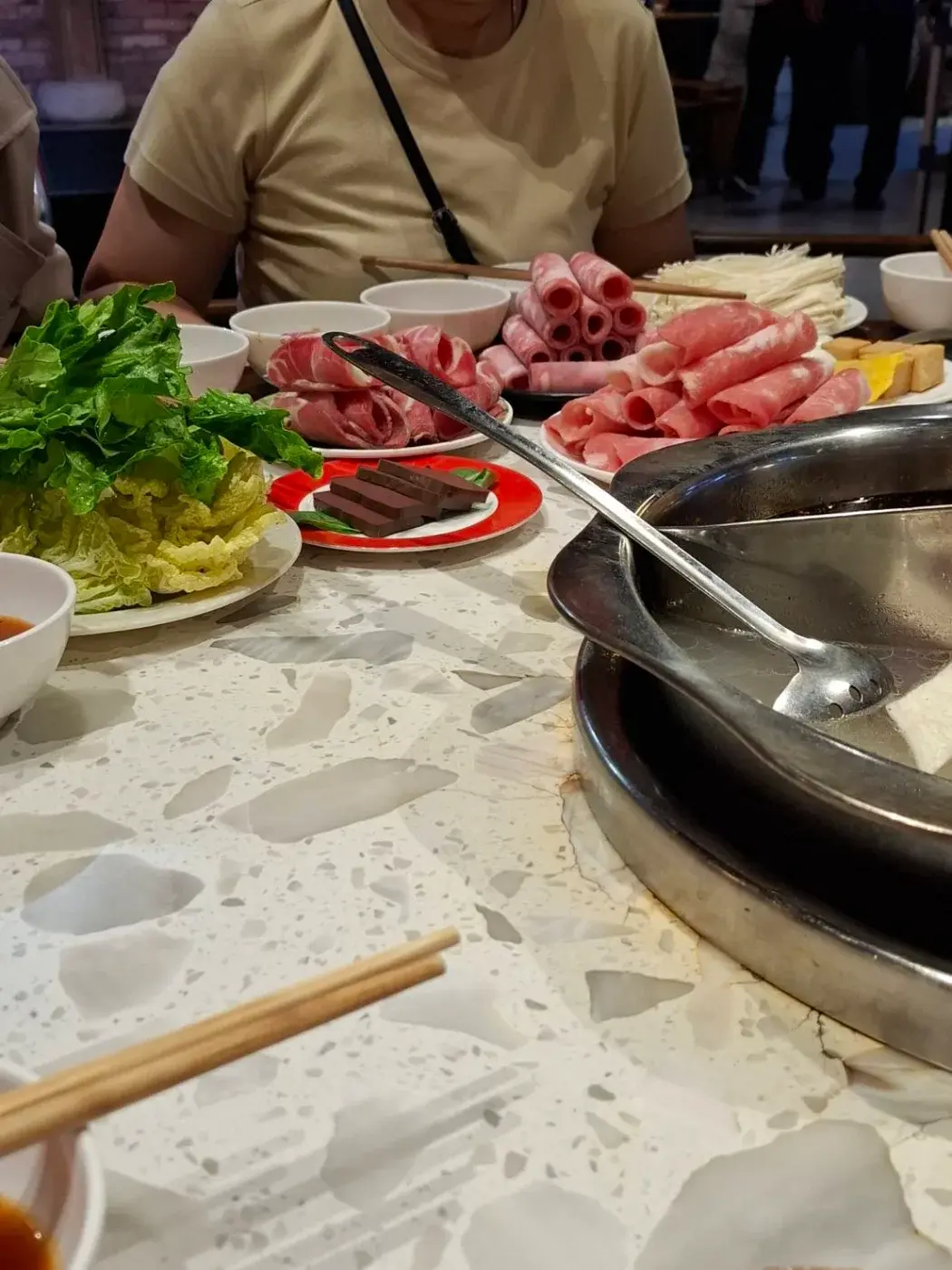 หลังจากที่เหนื่อยจากการเดินซื้อของแล้ว ก็ถึงเวลาอาหารเย็น ซึ่งแน่นอนต้องเป็นสุกี้หม่าล่า อาหารเลื่องชื่อของนครฉงชิ่ง ร้านที่ไปนี่ค่อนข้างลึกลับ (หัวเราะ) เพราะกว่าจะเดินไปถึง ก็เดินไกลอีกแล้ว เป็นร้านชื่อดัง คนเต็มทุกโต๊ะ มีอาหารให้เลือกมากมาย รวมทั้งเครื่องดื่มหลากหลายชนิด ซึ่งรวมอยู่ในค่าอาหารแล้ว โดยส่วนตัวไม่ค่อยสันทัดเรื่องหม่าล่าเท่าไหร่ก็เลยเลือกทานอาหารชนิดอื่น แต่เห็นเพื่อนบอกว่า แซบมาก