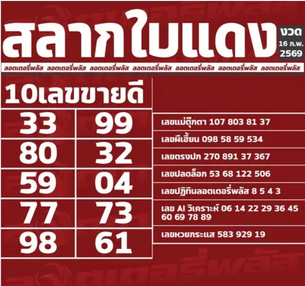 10 เลขขายดี "สลากใบแดง" งวดวันที่ 16 กุมภาพันธ์ 69..พรุ่งนี้รวย รีบซื้อหวยด่วน!!