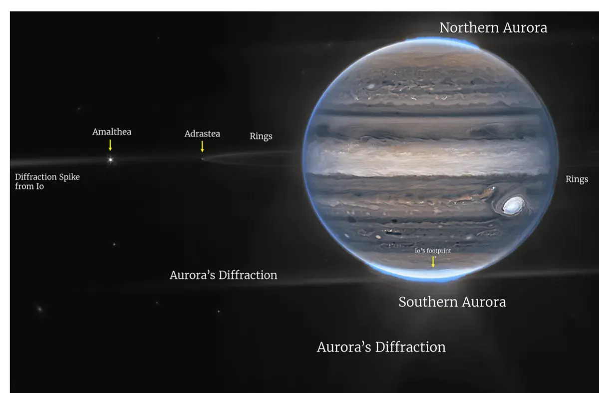 อย่างแรกที่เด่นมาก ๆ คือ แสงออโรรา (Auroras) ที่ขั้วเหนือและขั้วใต้ของดาวพฤหัสบดี ในภาพจะเห็นเป็นแสงสว่างเรือง ๆ ออกโทนฟ้า ๆ ซึ่งในบริบทของภาพอินฟราเรด ความสว่างแบบนี้มักสื่อถึง “พลังงานสูง” หรือบริเวณที่เกิดกิจกรรมรุนแรง ออโรราของดาวพฤหัสเกิดจากอนุภาคมีประจุพลังงานสูงที่พุ่งเข้ามาปะทะกับชั้นบรรยากาศ แล้วโดนสนามแม่เหล็กที่ทรงพลังมาก ๆ ของดาวพฤหัส “ดึงและเร่ง” ให้เกิดการปล่อยแสงออกมา ที่น่าสนใจคือไม่ได้มีแค่ลมสุริยะจากดวงอาทิตย์เท่านั้น แต่ดวงจันทร์ ไอโอ (Io) ก็มีส่วนเกี่ยวข้องด้วย เพราะมันส่งผลกับสภาพพลาสมาและอนุภาคที่วนอยู่รอบ ๆ ดาวพฤหัส
