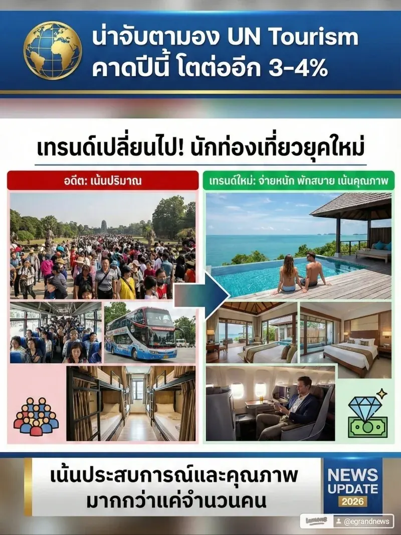 💡 น่าจับตามอง: UN Tourism คาดปีนี้โตต่ออีก 3-4% แต่เทรนด์เปลี่ยนไป! นักท่องเที่ยวยุคใหม่เน้น "จ่ายหนัก พักสบาย" เน้นคุณภาพมากกว่าแค่ปริมาณครับ