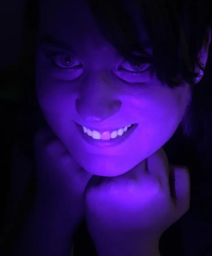 1. วันนี้ฉันพบว่าฟันปลอมด้านหน้าของฉันไม่ได้เรืองแสงเมื่ออยู่ใต้แสงของแบล็กไลท์