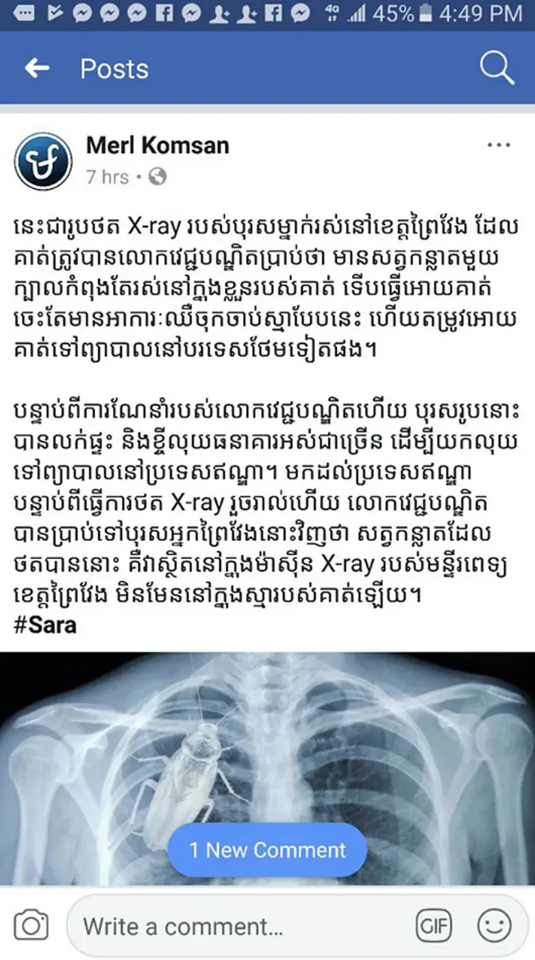 กระทรวงสาธารณสุขกัมพูชา ตำหนิการแชร์ภาพเอกซเรย์แมลงสาบ กระทรวงสาธารณสุขกัมพูชาได้เรียกร้องให้ผู้ใช้ Facebook หยุดแชร์ข้อมูลที่ไม่มีมูลความจริง ซึ่งบิดเบือนข้อเท็จจริงและส่งผลกระทบต่อเกียรติยศของภาคส่วนสาธารณสุข รวมถึงสร้างความสับสนให้กับประชาชน
