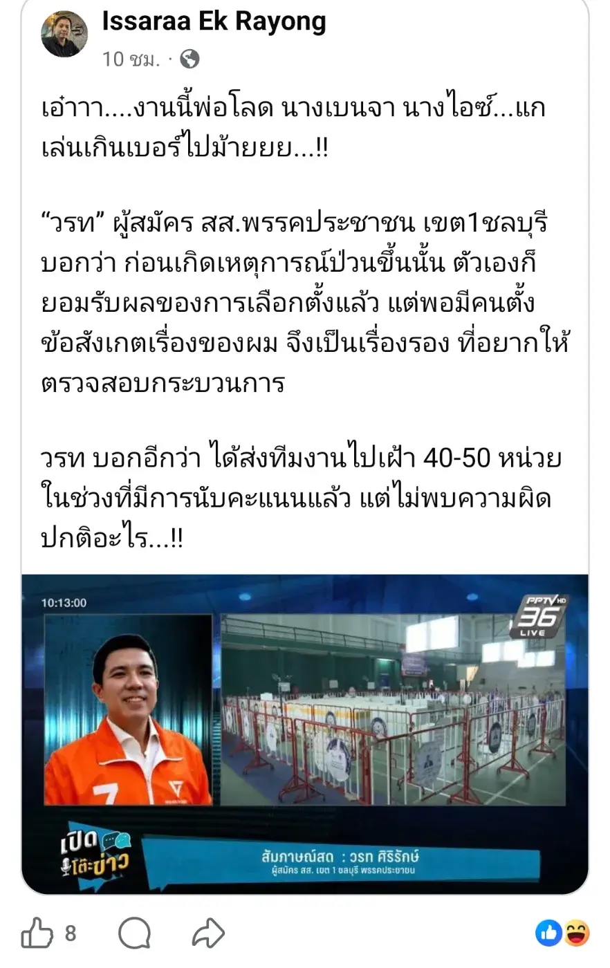 6.ที่ชลบุรี สุชาติ ชมกลิ่น คือคู่แค้นของไอซ์รักชนกและพรรคส้ม ตรงนั้นคือจุดยุทธศาสตร์ พรรคส้มหวังผลมาก เพราะสู้กันตั้งแต่การปั่นกระแสประกันสังคม (ทั้งๆที่ในประกันสังคมส่วนใหญ่เป็นสีส้ม) อีกอย่าง ถ้าเขตนั้นจะโกงจริงๆคงไม่เหลือกระดาษนับคะแนนทิ้งให้เห็นหรอก เขตนี้สุดท้ายส้มจะโป๊ะแตก แต่ส้มจะรับความจริงไม่ได้ จากนั้น ด้อมส้มที่ทำผิดกฎหมายในหน่วยเลือกตั้ง จะถูกดำเนินคดี แกนนำก็จะปั่นกระแสว่าจับแต่คนเห็นต่าง โกงๆๆ