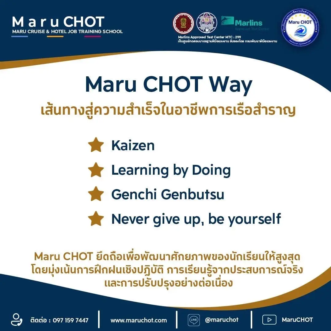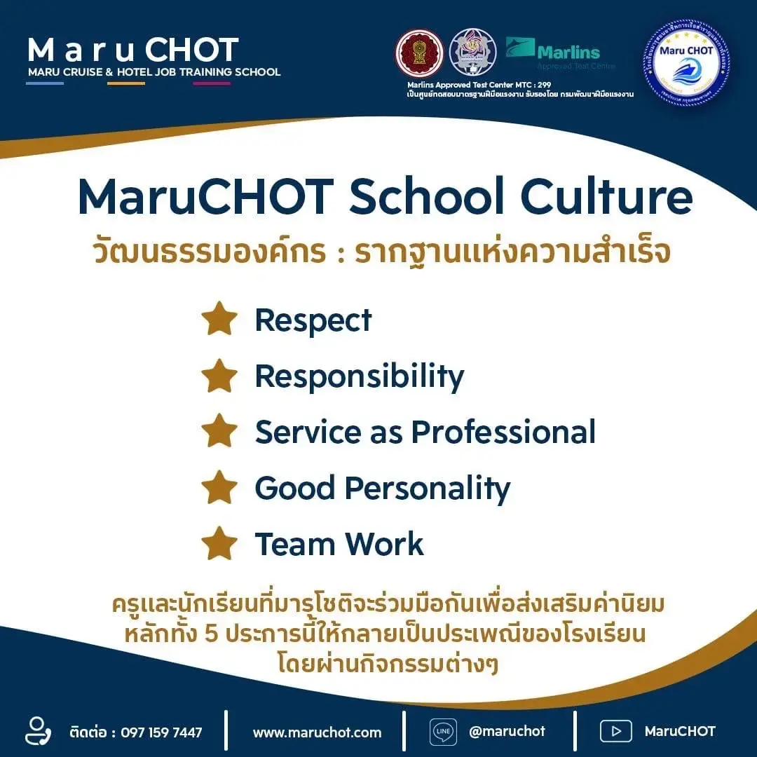 ณ โรงเรียนมารุโชติ (MaruCHOT School) หรือชื่อเต็ม "โรงเรียนมารุสอนการอาชีพเรือสำราญและการโรงแรม (Maru Cruise & Hotel Training School)" เราคือสถาบันสอนอาชีพหลักสูตรสั้นระดับแนวหน้าของประเทศไทย ที่มุ่งมั่นสร้างบุคลากรคุณภาพเพื่อขับเคลื่อนอุตสาหกรรมบริการระดับโลก ด้วยความเข้าใจอย่างลึกซึ้งในทุกมิติของงานบริการ เราภูมิใจที่ได้รับการรับรองหลักสูตรอย่างเป็นทางการจากสำนักงานคณะกรรมการส่งเสริมการศึกษาเอกชน (ส.ช.) กระทรวงศึกษาธิการ (เลขที่ใบอนุญาต กร.22/2564) และเป็นศูนย์ทดสอบมารีนเทส (Marlins Approved Test Center MTC : 299) ที่ได้รับการแต่งตั้งโดย Marlins UK รวมถึงเป็นศูนย์ทดสอบมาตรฐานแรงงานด้านการบริการอาหารและเครื่องดื่ม