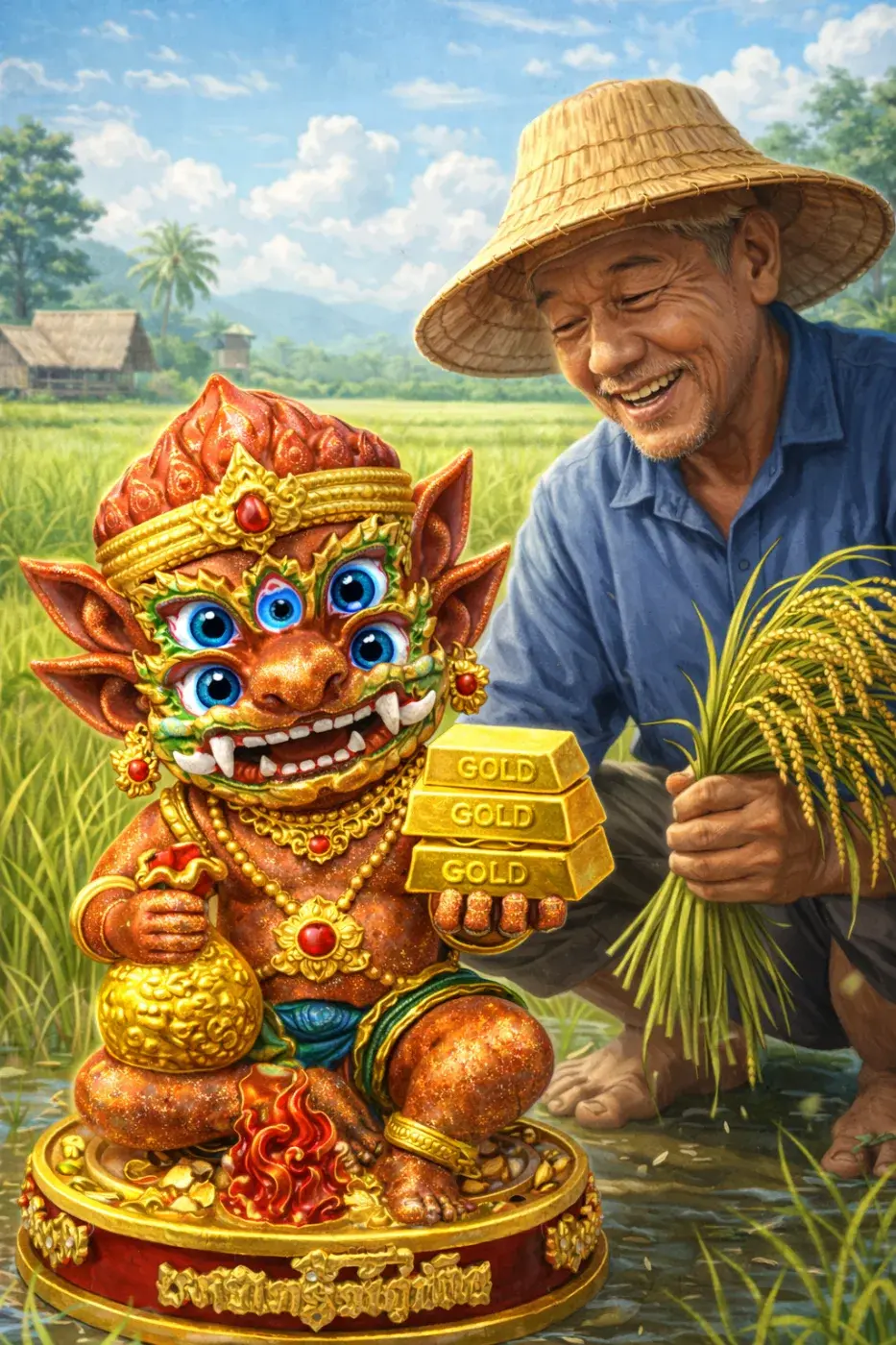 จนรุ่งเช้าชายยากจนกลับพบว่าสิ่งที่ 4 หู 5 ตาขับถ่ายออกมานั้นไม่ใช่อุจจาระธรรมดา แต่มันคือก้อนทองคำอันบริสุทธิ์จนทำให้ชายยากจนกลายเป็นมหาเศรษฐีและได้สมรสกับลูกสาวของเจ้าเมือง