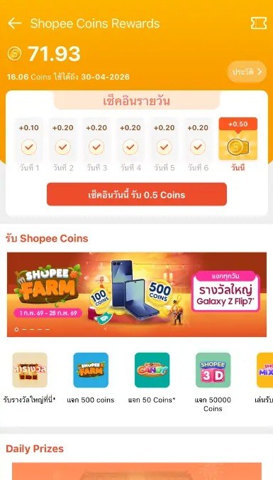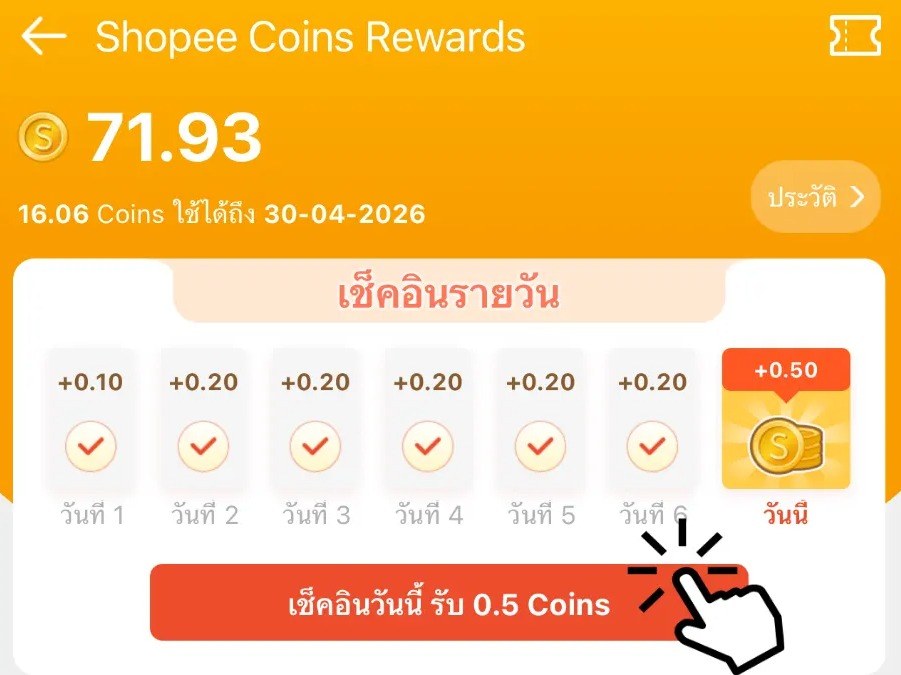 พอเข้ามาใน Shopee Coins แล้ว ก็จะเจอหน้าต่างตามในภาพ ให้กดเช็คอินเพื่อรับเหรียญ