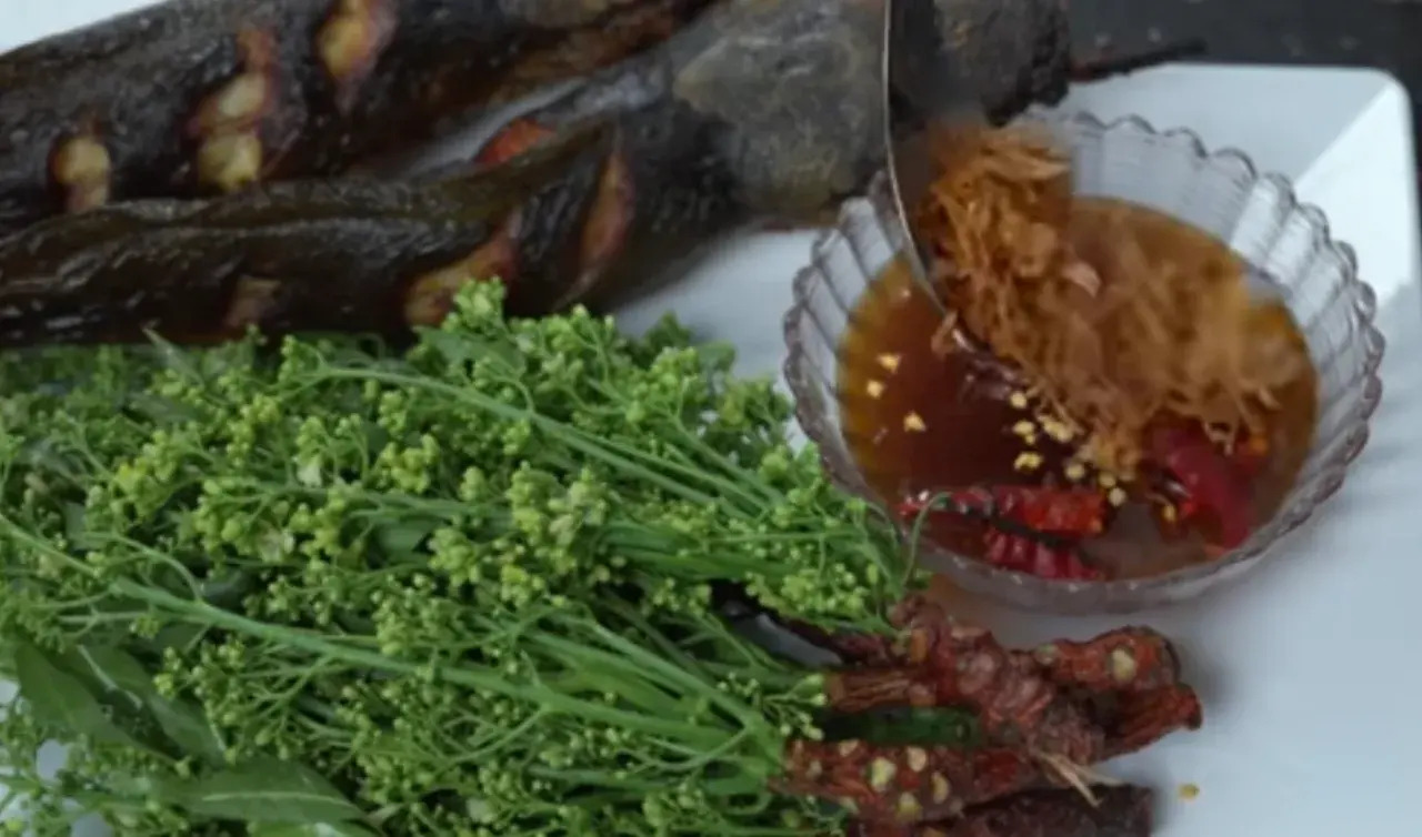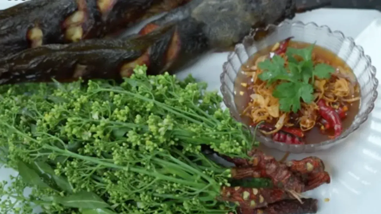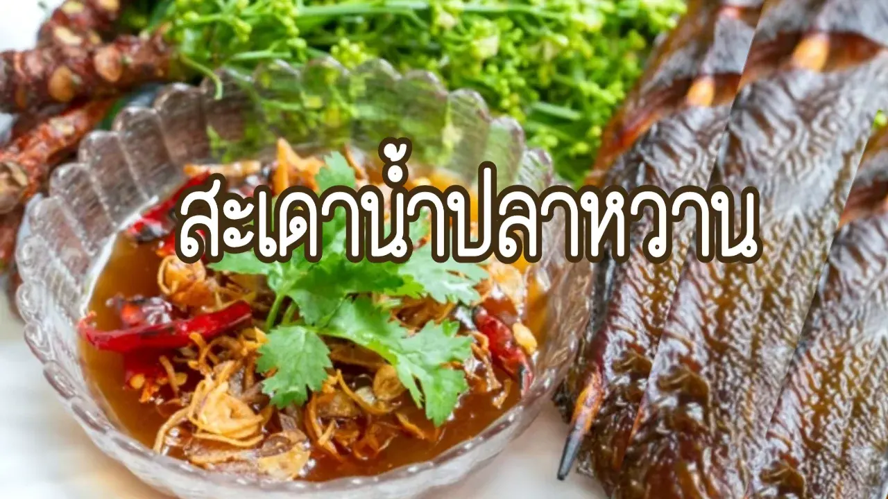 7. นำสะเดาลงจาน พร้อมรับประทานคู่กับน้ำปลาหวานที่รสชาติหวานนำ มีความเปรี้ยว เค็ม และเผ็ดตาม โดยตักน้ำปลาหวานใส่ลงถ้วย
