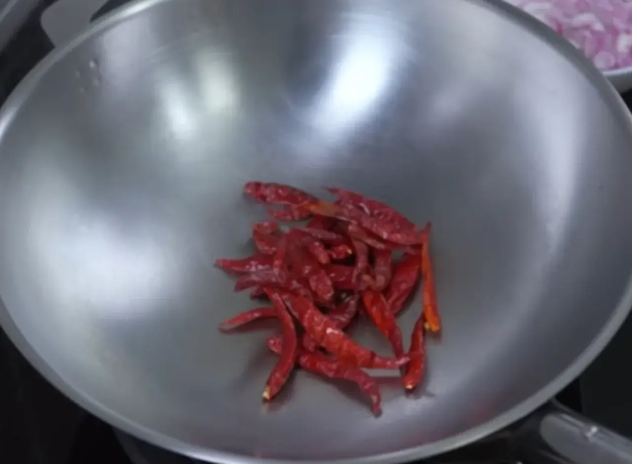 3. จัดการมาทำน้ำปลาหวาน โดยเริ่มจากนำพริกแห้งมาคั่ว ให้กรอบส่งกลิ่นหอม แล้วตักพักไว้ ขั้นตอนนี้ใช้ไฟกลางไปทางอ่อนนะคะ เพื่อป้องกันพริกคั่วของเราไหม้ เป็นสีดำ นอกจากผิวพริกคั่วไม่สวยแล้ว อาจจะมีรสขมได้