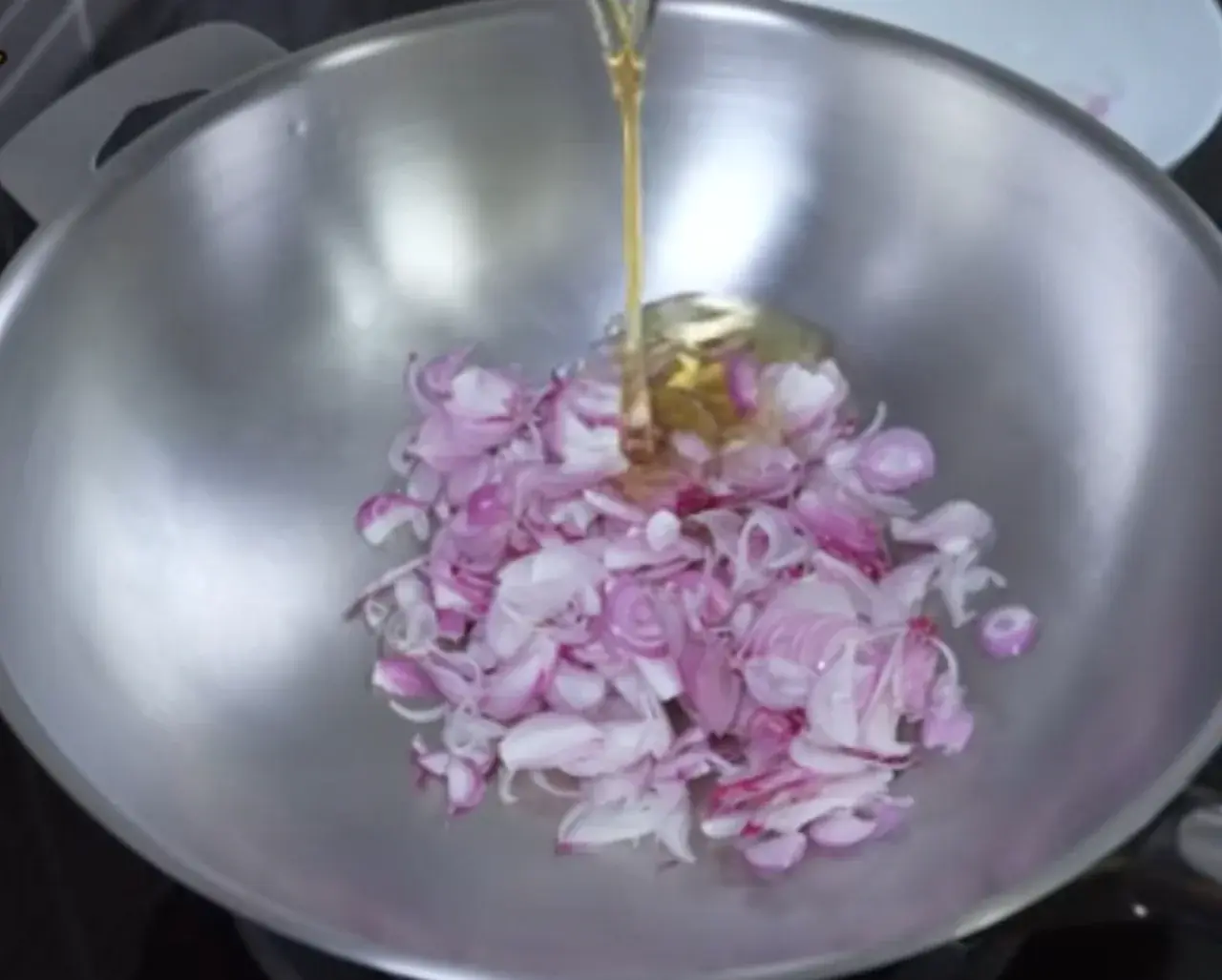 4. เมื่อคั่วพริกเสร็จ ก็ถึงคิวทำหอมเจียว นำหอมแดงซอยลงกระทะ เติมน้ำมันลงไป เปิดแก๊สด้วยไฟกลางค่อนไปอ่อน