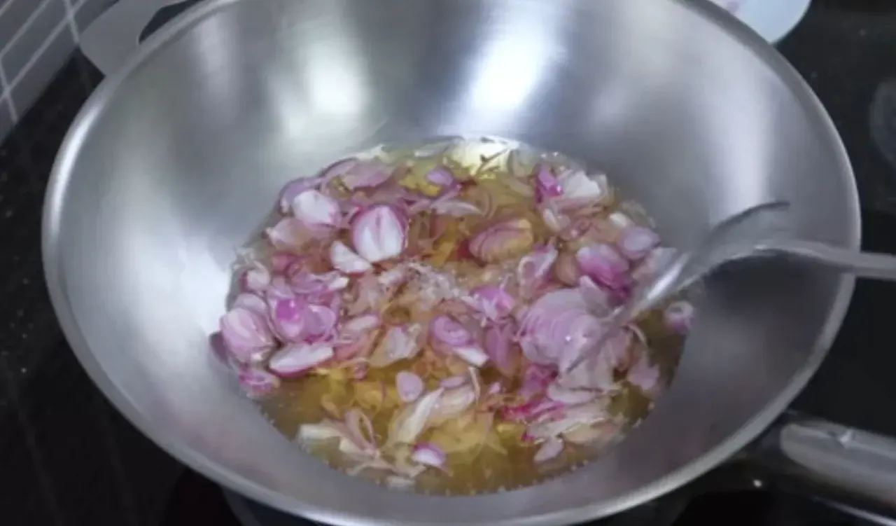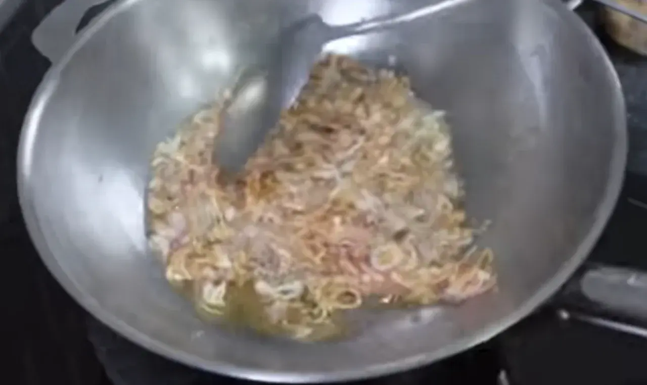 เมื่อเจียวไปาักพัก จนหอมแดงเริ่มเหลือง ก็ถือว่าใช้งานได้แล้ว