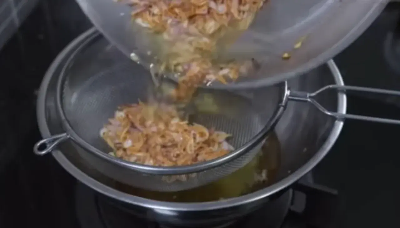 นำหอมเจียวมาพักสะเด็ดน้ำมัน ความร้อนจะทำให้หอมเจียวสีเข้มขึ้นกว่าเดิม เราจะเกลี่ยเพื่อให้คายความร้อน ขั้นตอนนี้หากเราเจียวหอมแดงจนสุกเหลืองเขม เมื่อเราเอามาสะเด็ดน้ำมัน สีหอมเจียวจะไปทางน้ำตาลเข้ม ดูแล้วไม่น่ารับประทาน