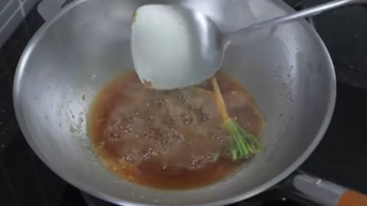 5. นำกระทะใบเดิมที่เจียวหอมแดงเสร็จมาใส่รากผักชี และอัตราส่วนผสมอื่นๆที่เหลือลงกระทะ เพื่อเคี่ยวทำน้ำปลาหวาน