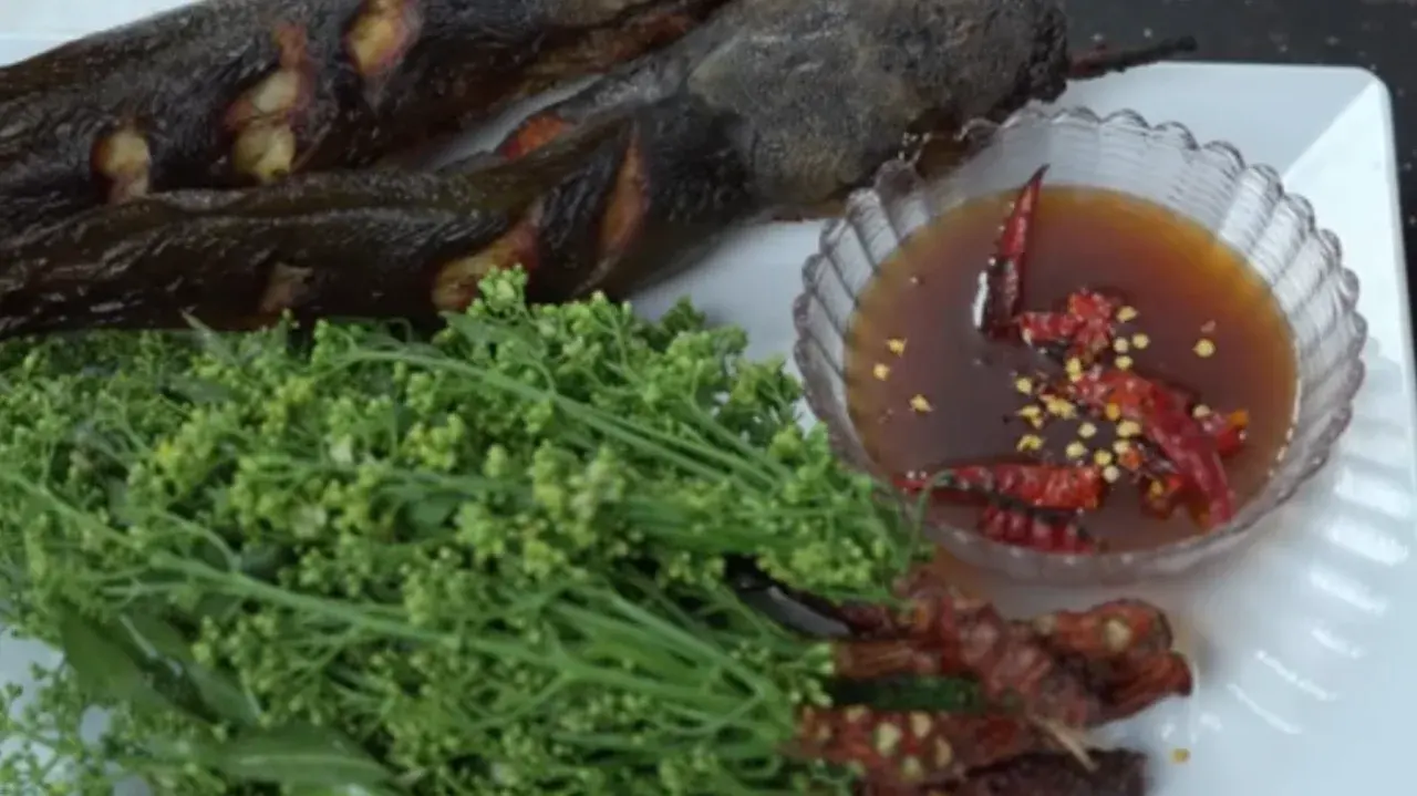 10. ตกแต่งหน้าน้ำแลาหวานด้วยผักชีเพื่อให้ดูดีเพิ่มสีสัน และที่สำคัญมีปลาดุกย่างหอมๆ กินเป็นเครื่องเคียง