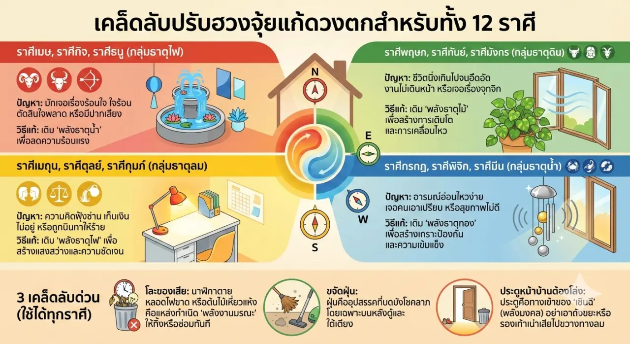 นี่คือเคล็ดลับปรับฮวงจุ้ยแก้ดวงตกสำหรับทั้ง 12 ราศีครับ