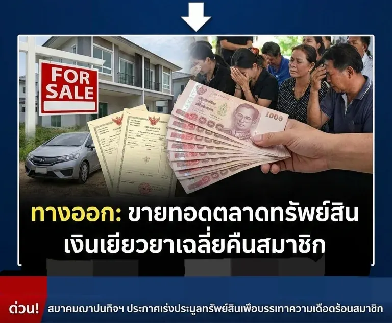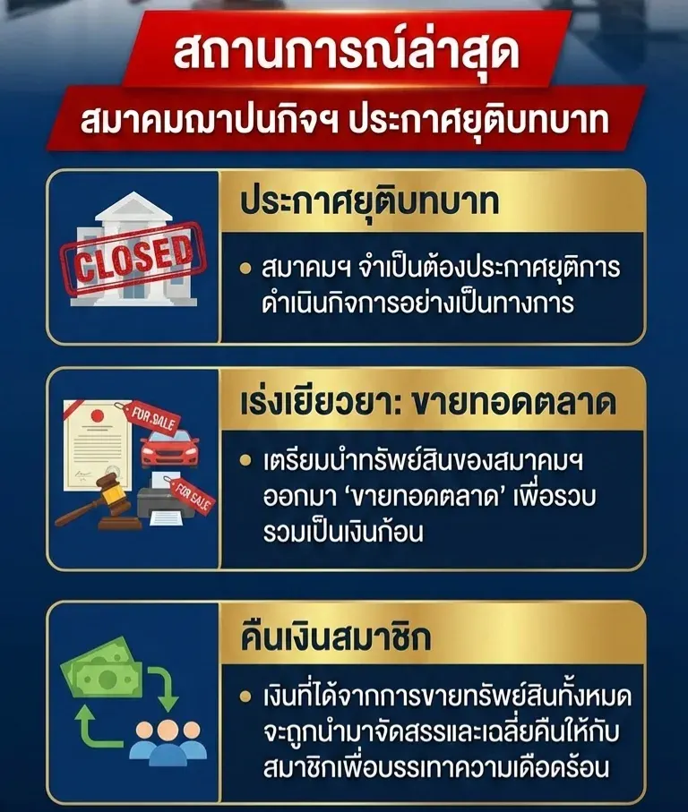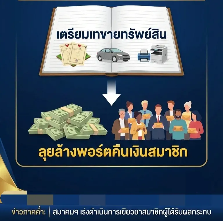 เร่งเยียวยา เตรียมนำทรัพย์สินของสมาคมฯ ออกมา "ขายทอดตลาด" เพื่อรวบรวมเป็นเงินก้อนคืนเงินสมาชิก เงินที่ได้จากการขายทรัพย์สินทั้งหมด จะถูกนำมาจัดสรรและเฉลี่ยคืนให้กับสมาชิกเพื่อบรรเทาความเดือดร้อน