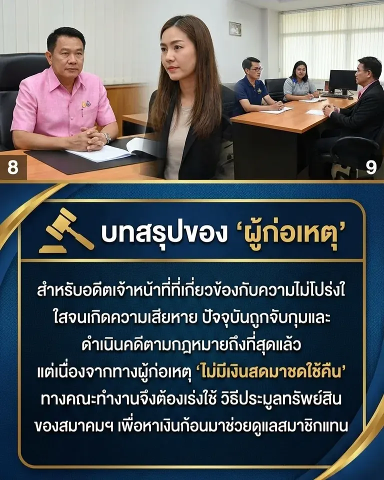 สำหรับเจ้าหน้าที่ที่กระทำการทุจริตจนเป็นเหตุให้เกิดความเสียหาย ขณะนี้ถูกเจ้าหน้าที่จับกุมและดำเนินคดีตามกฎหมายเป็นที่เรียบร้อยแล้ว แต่เนื่องจากผู้ก่อเหตุไม่มีเงินสดมาใช้คืนทางสมาคมฯ จึงจำเป็นต้องใช้วิธีนำทรัพย์สินออกประมูลเพื่อหาเงินมาคืนพี่น้องสมาชิกแทน