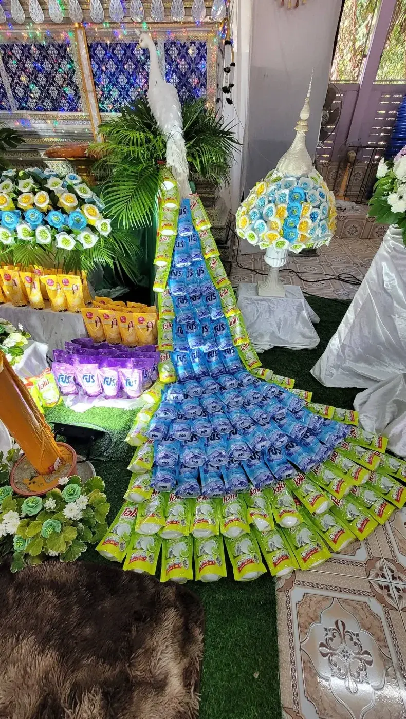 หากเรานั้นนำมาทดแทนในส่วนของดอกไม้จะประหยัดและมากกว่านั้นคือการลดในส่วนของขยะนั้นออกไป โฟมไม่ต้องใช้เยอะเรานั้นใช้เพียงในส่วนของหัวที่แกะเป็นนกยูง มาจากเดิมอาจจัต้องเพิ่มเติมด้วยสีสัน