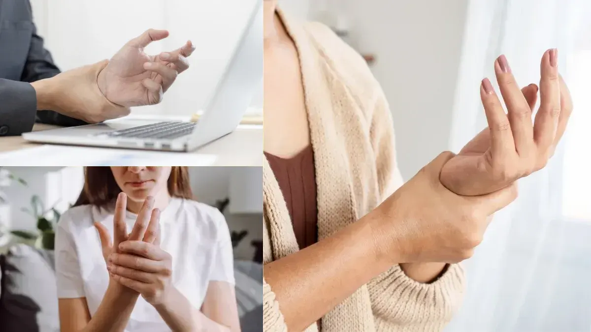 5.ชาปลายนิ้วมือเกือบทุกนิ้ว แต่ไม่มีอาการชาปลายเท้า มักจะชาช่วงกลางคืนหรือก่อนนอน อาจเกิดจากการใช้งานมือหนักมากเกินไป เช่น ขี่มอเตอร์ไซค์ต่อเนื่องนาน ๆ เล่นโทรศัพท์บ่อย ๆ นาน ๆ ซึ่งอาจทำให้เอ็นกดทับเส้นประสาทตรงข้อมือ