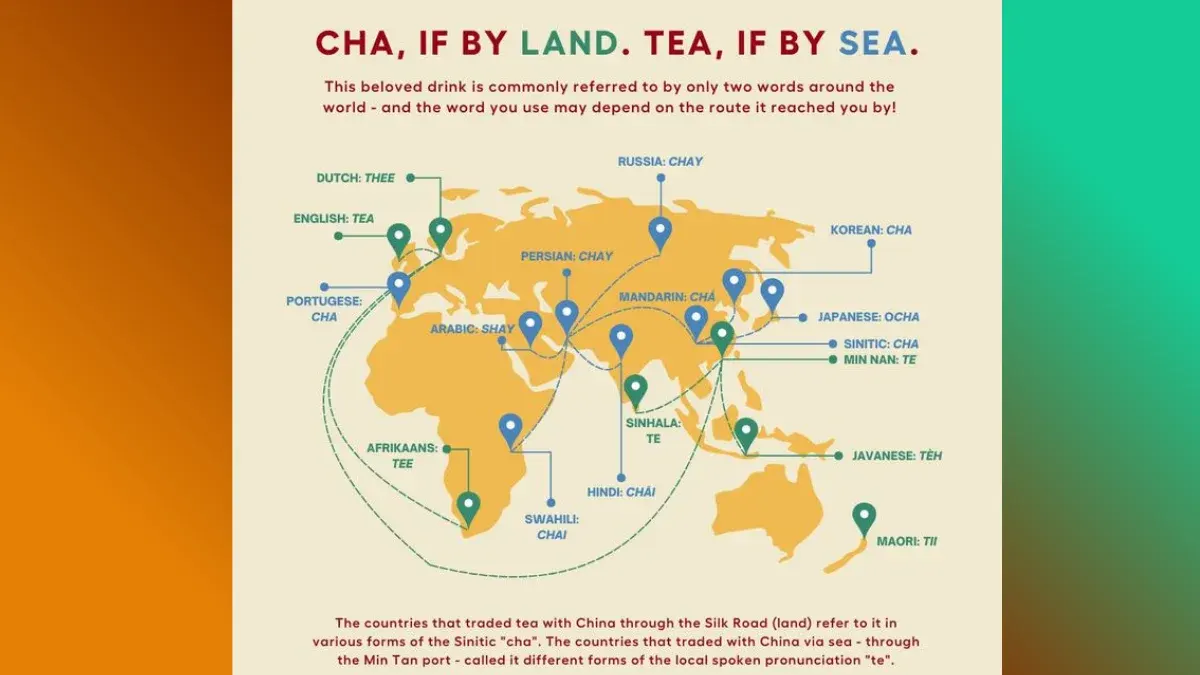 อย่างไรก็ตาม ชื่อเรียกของ "ชา" ทั่วโลกจึงเป็นหลักฐานทางมานุษยวิทยาที่แบ่งโลกออกเป็น 2 กลุ่มตามเส้นทางการค้าโบราณอย่างชัดเจน ประเทศที่รับผ่านเส้นทางบกจะอยู่ในกลุ่ม "Cha" ขณะที่ประเทศที่รับผ่านเส้นทางทะเลจะอยู่ในกลุ่ม "Tea" ความหลากหลายทางภาษานี้จึงไม่ได้เป็นเพียงชื่อเรียกเครื่องดื่ม แต่คือบันทึกที่มีชีวิตซึ่งบอกเล่าเรื่องราวเศรษฐกิจ การเดินเรือ และความเชื่อมโยงของผู้คนทั่วโลกที่ส่งต่อกันมาผ่านน้ำชาเพียงแก้วเดียว