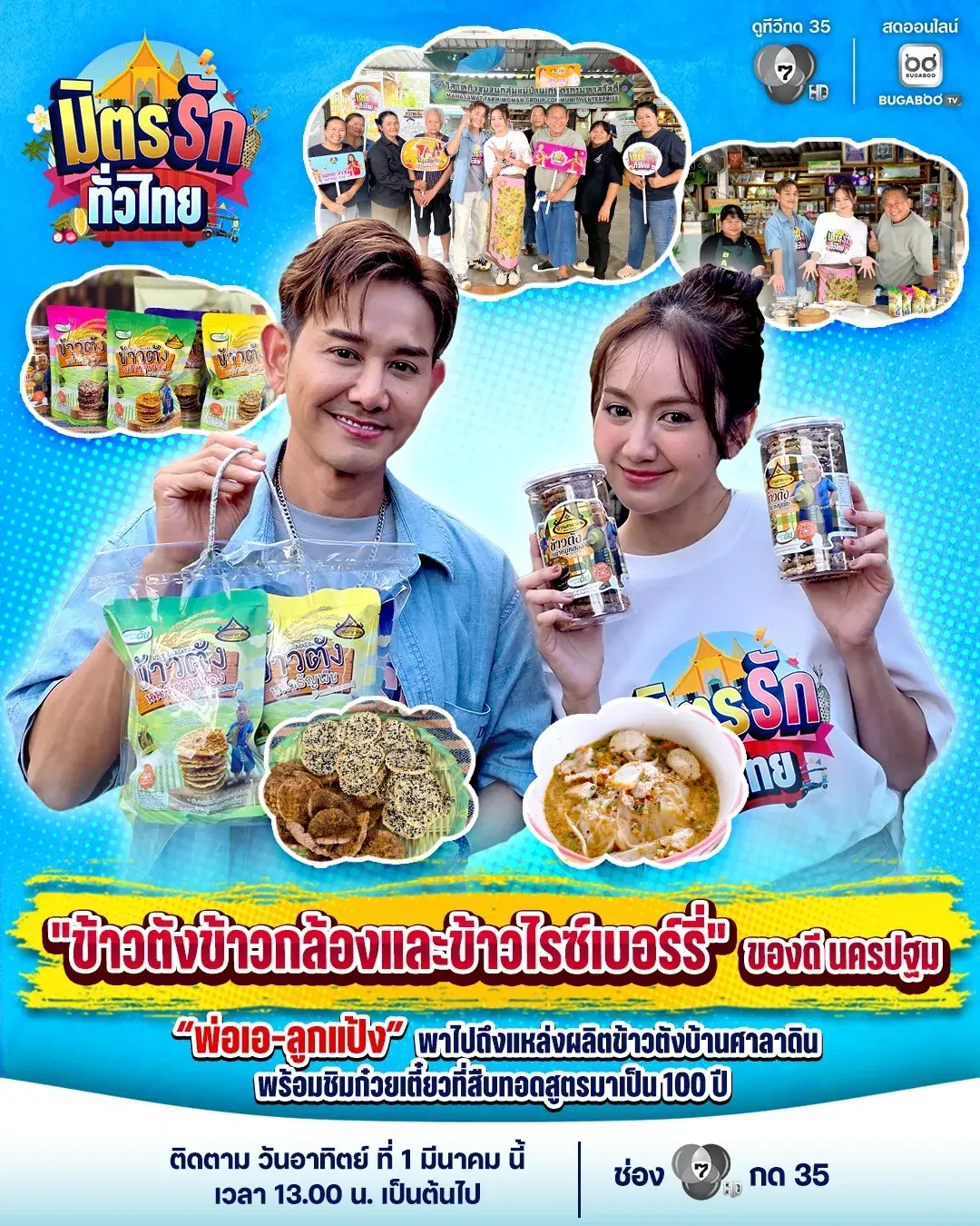 🎥 #มิตรรักทั่วไทย พ่อเอ ลูกแป้ง พาไปถึงแหล่งผลิตข้าวตัง ของดีขึ้นชื่อของชุมชน กลุ่มแม่บ้านเกษตรกรมหาสวัสดิ์นคร อ.พุทธมณฑล จ.นครปฐม 📍และชุมชนยังส่งเสริมการท่องเที่ยวเชิงวิถีชีวิต โดยจัดทริปล่องเรือชมชุมชนบ้านศาลาดิน ✨️ ก่อนแวะ “นาบัวลุงแจ่ม” แหล่งปลูกบัวหลวงขนาดใหญ่ พร้อมชิมก๋วยเตี๋ยวที่สืบทอดมาเป็น 100 ปี