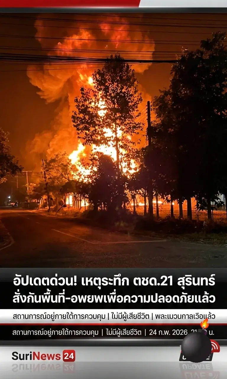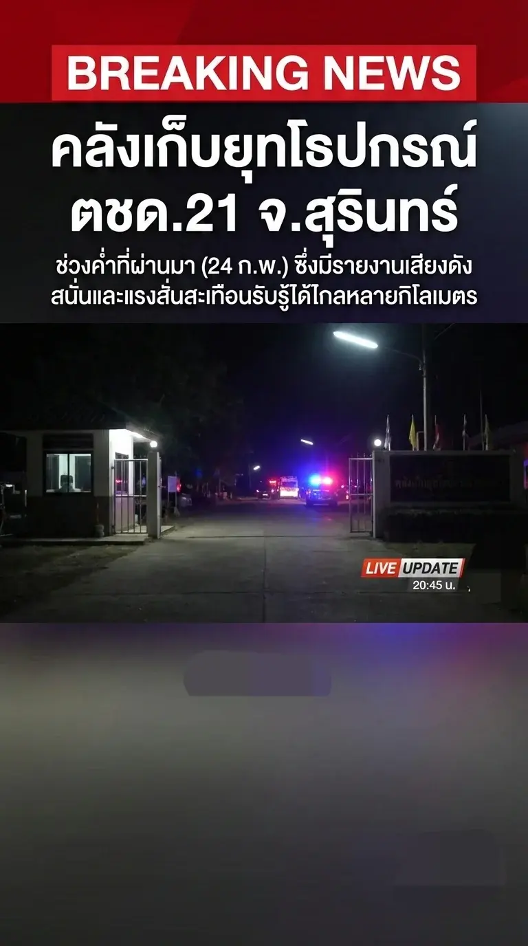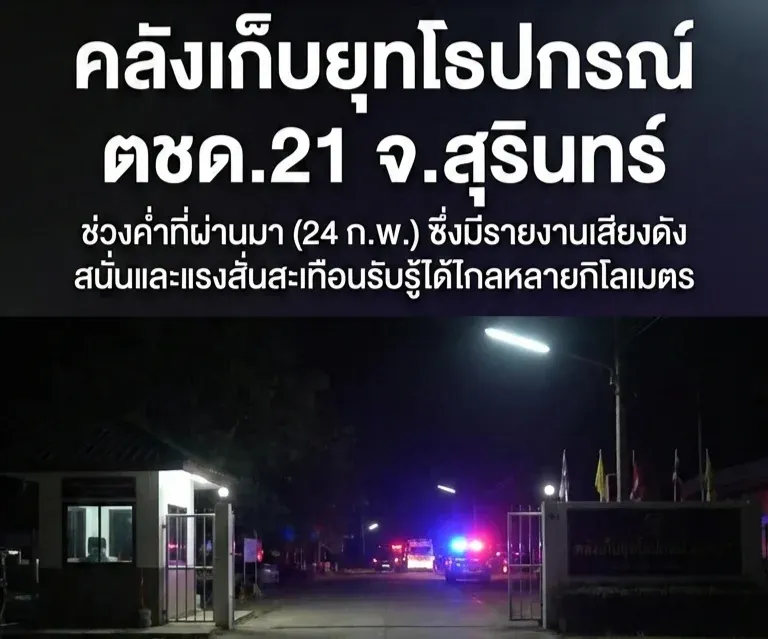 เกิดเหตุบริเวณคลังเก็บยุทโธปกรณ์ ตชด.21 จ.สุรินทร์ ช่วงค่ำที่ผ่านมา (24 ก.พ.) ซึ่งมีรายงานเสียงดังสนั่นและแรงสั่นสะเทือนรับรู้ได้ไกลหลายกิโลเมตร
