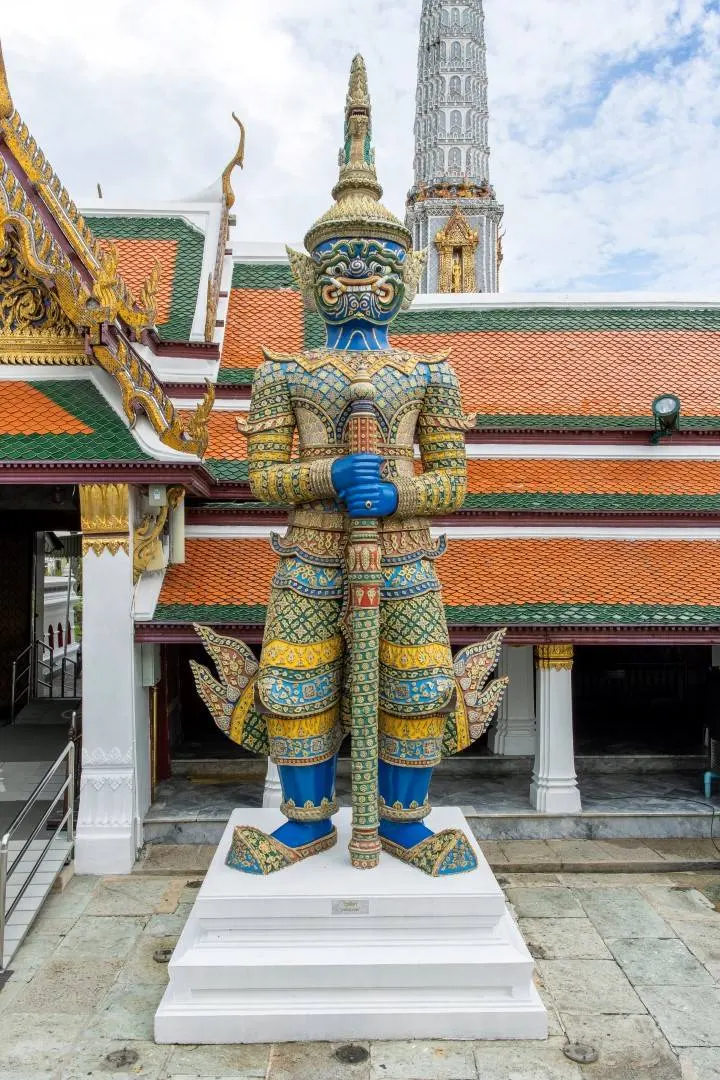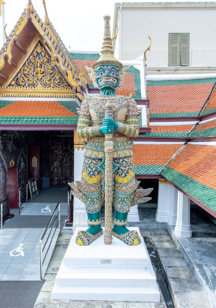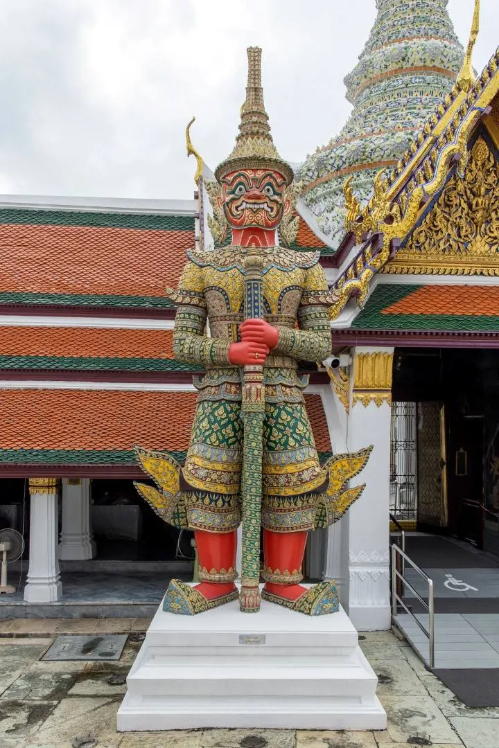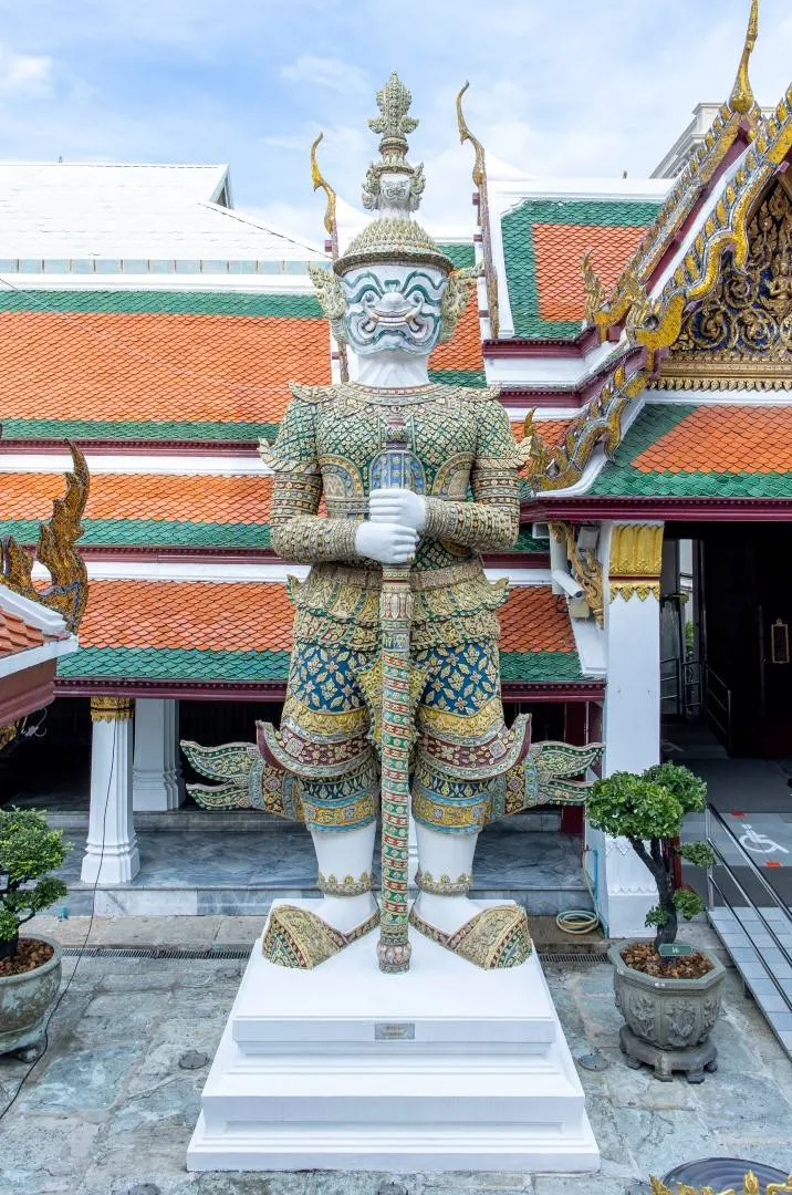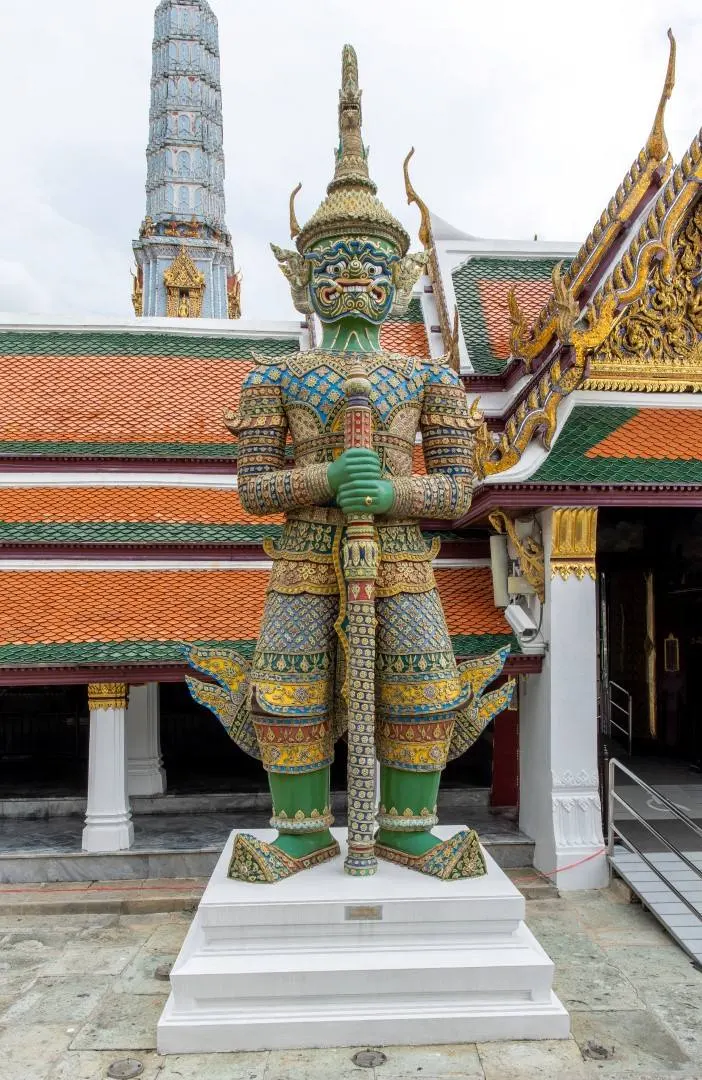 นี่คือภาพของเหล่ายักษ์ทวารบาลแห่งวัดพระศรีรัตนศาสดาราม หรือวัดพระแก้ว ไม่ได้ถูกสร้างขึ้นมาเพื่อความงามเพียงอย่างเดียว หากแต่มีสถานะเป็น “ผู้พิทักษ์ประตู” ตามคติความเชื่อโบราณ ทำหน้าที่คอยคุ้มครองเขตพุทธาวาสและสิ่งศักดิ์สิทธิ์ภายในวัดให้พ้นจากหมู่มารและสิ่งอัปมงคล การปรากฏตัวของยักษ์ที่ยืนตระหง่านเฝ้าทางเข้า จึงเปรียบเสมือนด่านแรกของความศักดิ์สิทธิ์ ที่บอกผู้มาเยือนตั้งแต่ก้าวแรกว่านี่คือพื้นที่อันทรงคุณค่าทั้งทางศาสนาและพระราชอำนาจ