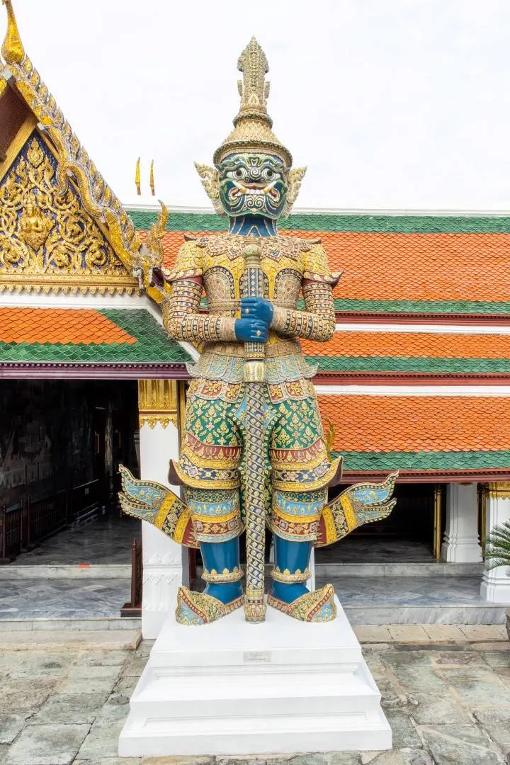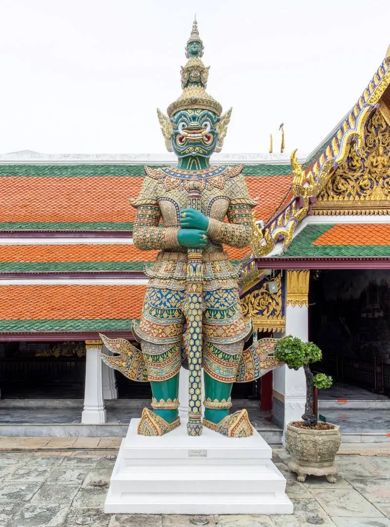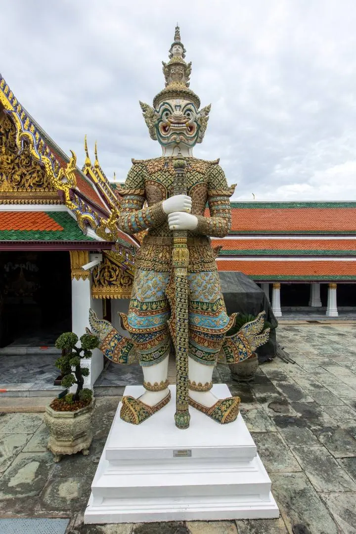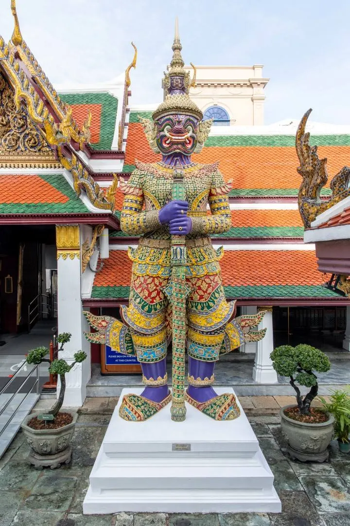 นี่คือภาพของเหล่ายักษ์ทวารบาลแห่งวัดพระศรีรัตนศาสดาราม หรือวัดพระแก้ว ไม่ได้ถูกสร้างขึ้นมาเพื่อความงามเพียงอย่างเดียว หากแต่มีสถานะเป็น “ผู้พิทักษ์ประตู” ตามคติความเชื่อโบราณ ทำหน้าที่คอยคุ้มครองเขตพุทธาวาสและสิ่งศักดิ์สิทธิ์ภายในวัดให้พ้นจากหมู่มารและสิ่งอัปมงคล การปรากฏตัวของยักษ์ที่ยืนตระหง่านเฝ้าทางเข้า จึงเปรียบเสมือนด่านแรกของความศักดิ์สิทธิ์ ที่บอกผู้มาเยือนตั้งแต่ก้าวแรกว่านี่คือพื้นที่อันทรงคุณค่าทั้งทางศาสนาและพระราชอำนาจ