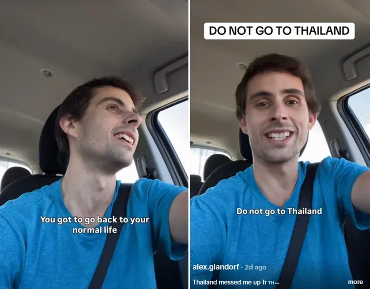 หนุ่มรายนี้เขามีชื่อว่า "อเล็กซ์" ได้โพสต์คลิปลงในช่อง TikTok ที่ชื่อ @alex.glandorf โดยเขาได้พูดผ่านกล้องในขณะที่กำลังขับรถอยู่ และเตือนคนอื่น ๆ ด้วยสีหน้าจริงจัง ระบุว่า "อย่าไปประเทศไทย อย่าได้ไปเชียว ผมรู้ว่าคุณกำลังคิดอยู่ ผมรู้ว่าคุณจองตั๋วเครื่องบินไปแล้ว แต่อย่านะ เชื่อผมเถอะ อย่าทำแบบนั้นเลย เพราะนี่คือสิ่งที่จะเกิดขึ้น.."