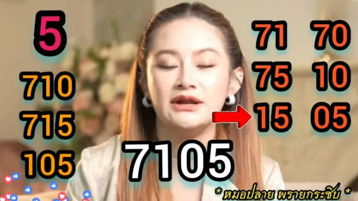 หมอปลาย พรายกระซิบ: ให้เลขเด่นคือ 5 โดยมีเลขชุด 3 ตัวที่น่าสนใจคือ 710, 715, 015 และเลข 2 ตัวเน้นไปที่ 71, 70, 10, 11, 05 พร้อมแนะนำผู้ที่เกิดเดือนมีนาคม เมษายน และกรกฎาคม ให้หมั่นสวดมนต์คาถาเงินล้านเพื่อเสริมโชคลาภ
