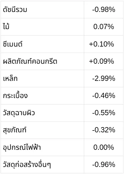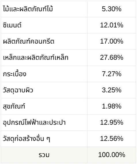 - วัสดุที่ราคาปรับราคาลดลง ได้แก่ เหล็ก ลดลง -2.99% กระเบื้อง ลดลง -0.46% วัสดุฉาบผิว ลดลง -0.55% สุขภัณฑ์ ลดลง -0.32% ลดลง -0.45% วัสดุก่อสร้างอื่นๆ ลดลง -0.96%