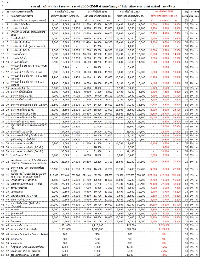 ราคาประเมินค่าก่อสร้างอาคาร พ.ศ. 2569 (ธันวาคม 2568)