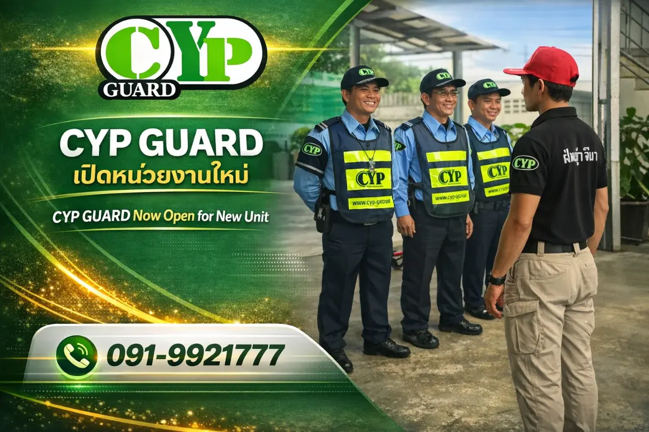 บริษัท CYP GUARD ขยายการให้บริการ เปิดหน่วยงานใหม่อย่างเป็นทางการ เพื่อรองรับความต้องการด้านงานรักษาความปลอดภัยที่เพิ่มขึ้นอย่างต่อเนื่อง พร้อมยกระดับมาตรฐานการทำงานให้มีประสิทธิภาพ ปลอดภัย และเป็นมืออาชีพมากยิ่งขึ้น