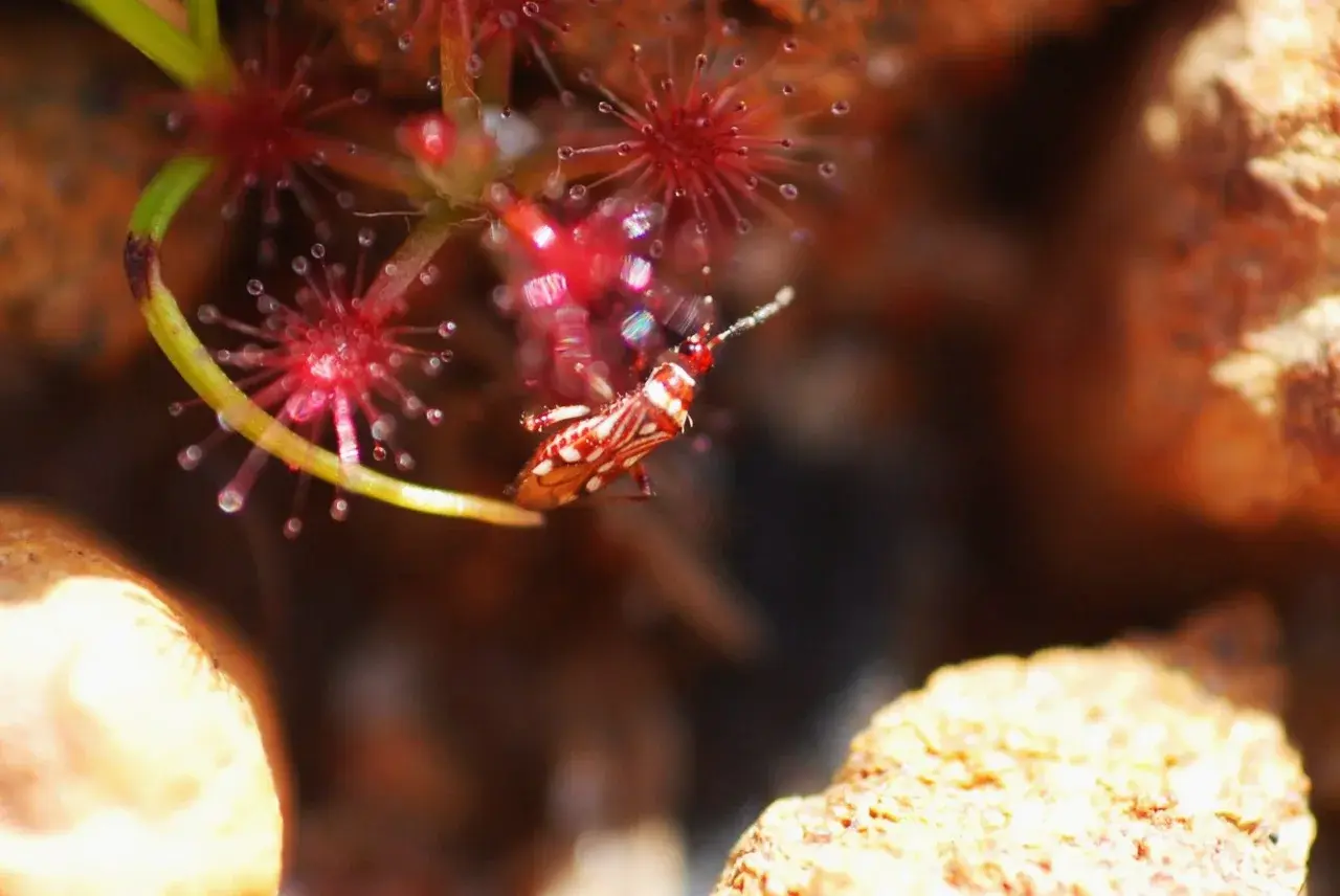 พอแมลงบินมาเกาะเพราะหลงคิดว่าเจอของอร่อย กลไกการล่าก็เริ่มทำงานทันทีเลยนะ มันไม่ได้จับเฉยๆ ด้วยกาวอย่างเดียว แต่ยัง “ขยับตัว” ได้ด้วย ขนรอบๆ เหยื่อจะค่อยๆ เอนเข้าหา เพื่อเพิ่มพื้นที่ยึดเกาะให้แน่นขึ้น เหมือนค่อยๆ รุมล็อกเป้าหมาย บางสายพันธุ์นี่โหดกว่าอีก ใบจะค่อยๆ ม้วนลงมาโอบเหยื่อไว้ คล้ายกำหมัดช้าๆ แต่แน่นอนมาก แล้วหลังจากนั้นมันก็ปล่อยเอนไซม์ออกมาย่อยโปรตีนจากตัวแมลง เปลี่ยนเป็นสารอาหารที่ตัวเองต้องการ โดยเฉพาะพวก ไนโตรเจน กับ ฟอสฟอรัส