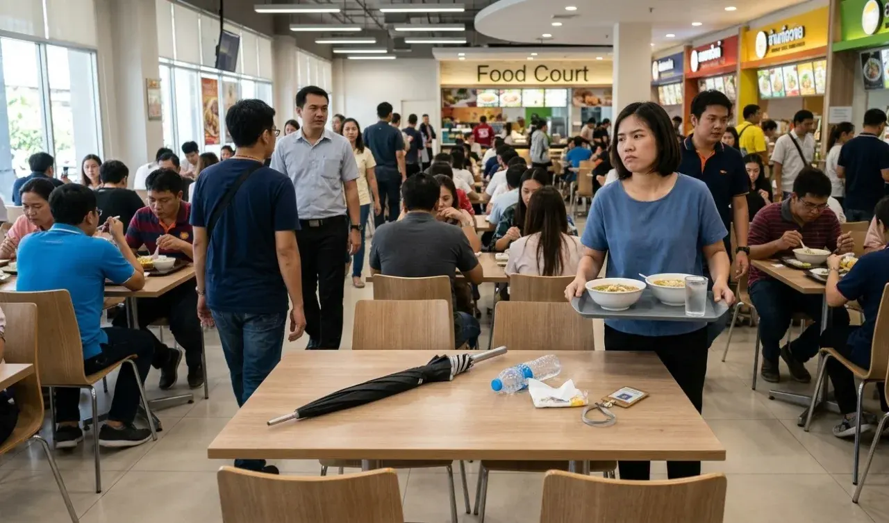 "โต๊ะนี้ของใคร? แฉนิสัยมักง่าย 'จองโต๊ะทิ้งไว้แต่ตัวหาย' ในศูนย์อาหาร...คนยืนรอจนขาแข็ง แต่ร่มจองที่นั่งหน้าตาเฉย! มารยาทสังคมไทยหายไปไหนหมด?"