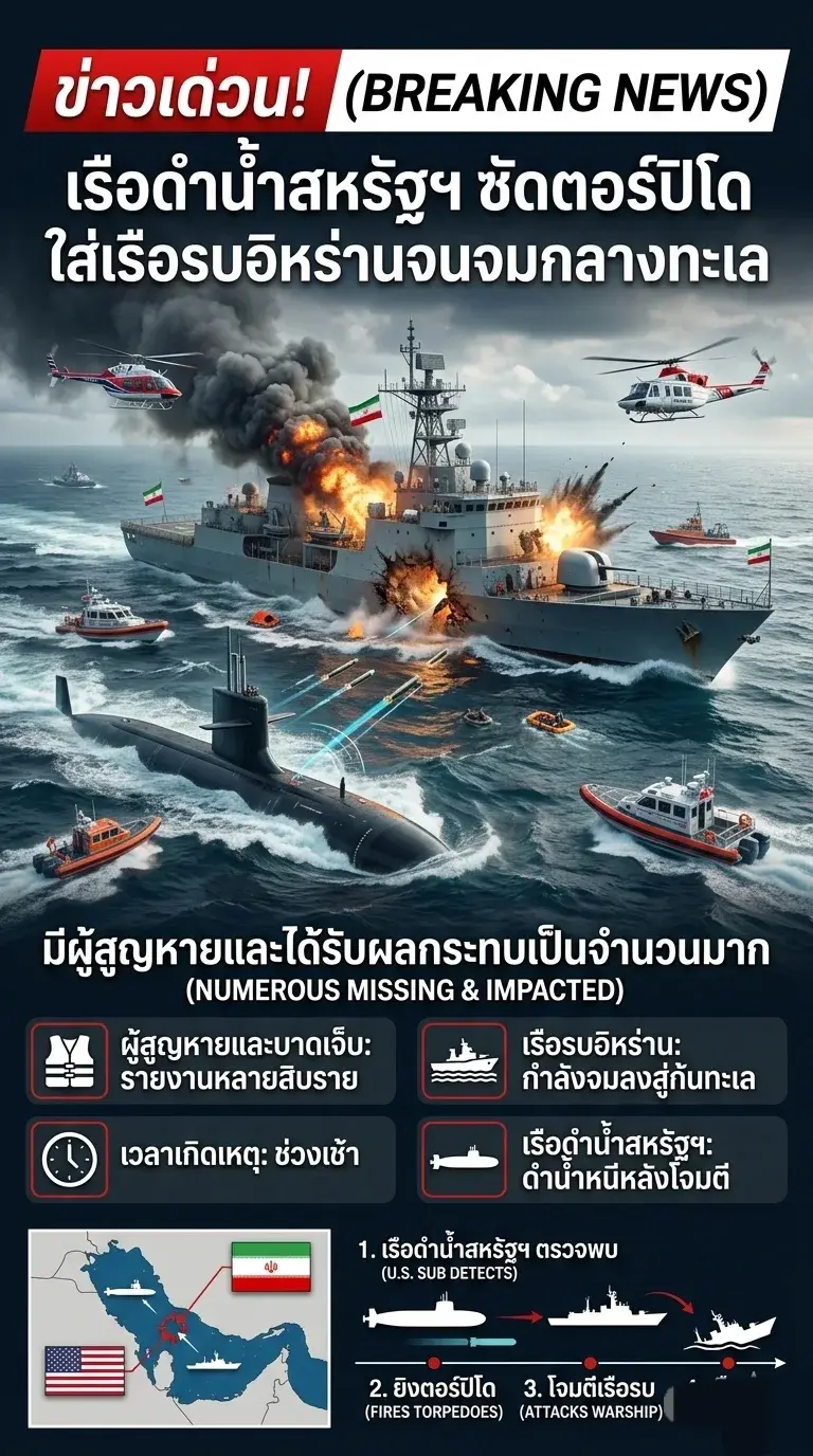 💥 เกิดอะไรขึ้น? เรือดำน้ำสหรัฐฯ ซัดตอร์ปิโดใส่เรือรบอิหร่านจนจมกลางทะเล มีผู้สูญหายและได้รับผลกระทบเป็นจำนวนมาก