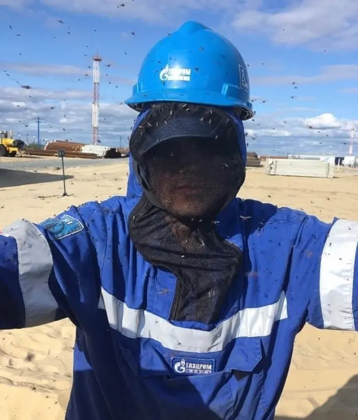 2. ฤดูร้อนในยามาล : คนงานสวมใส่ชุดแบบพิเศษเพื่อป้องกันตัวเองจากยุงและแมลง