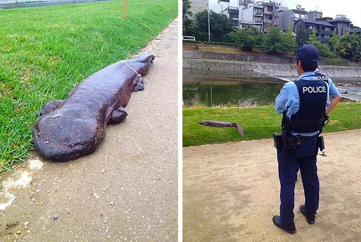 7. คนท้องถิ่นตกอกตกใจและโทรเรียกตำรวจเมื่อเจอสัตว์ประหลาดตัวนี้ที่คลานขึ้นมาจากแม่น้ำคาโมกาว่าในโตเกียว ซึ่งจริง ๆ แล้วมันคือตัวซาลาแมนเดอร์ยักษ์นั่นเอง