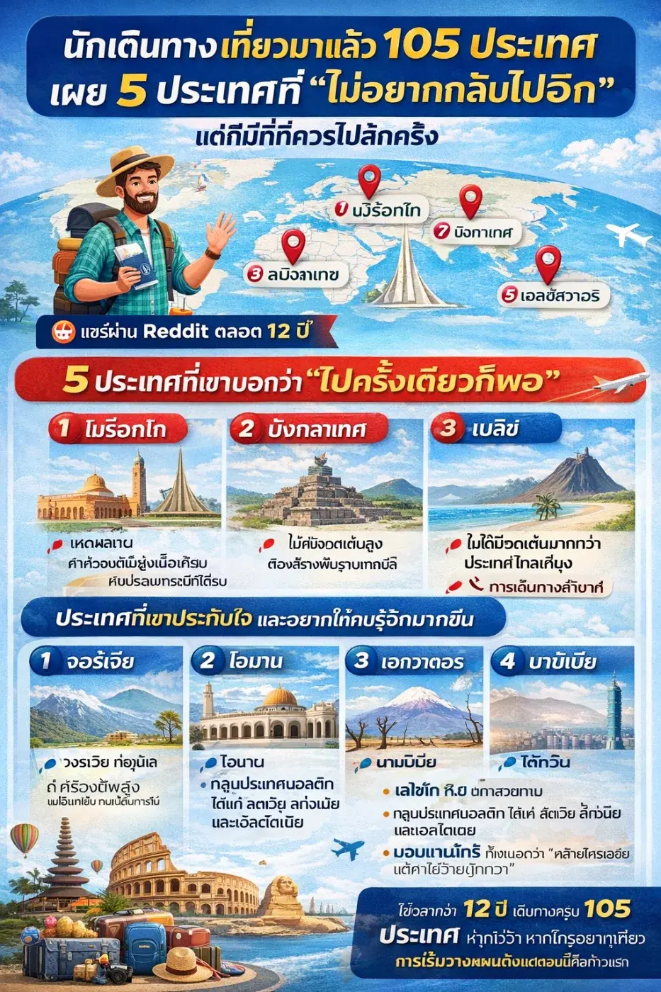 ชายคนหนึ่งที่เดินทางไปแล้วกว่า 105 ประเทศตลอด 12 ปี ได้แชร์ประสบการณ์ผ่านชุมชน Reddit (r/travel) โดยเล่าทั้งประเทศที่ไม่อยากกลับไปอีก และประเทศที่อยากแนะนำให้คนอื่นลองไปสักครั้ง