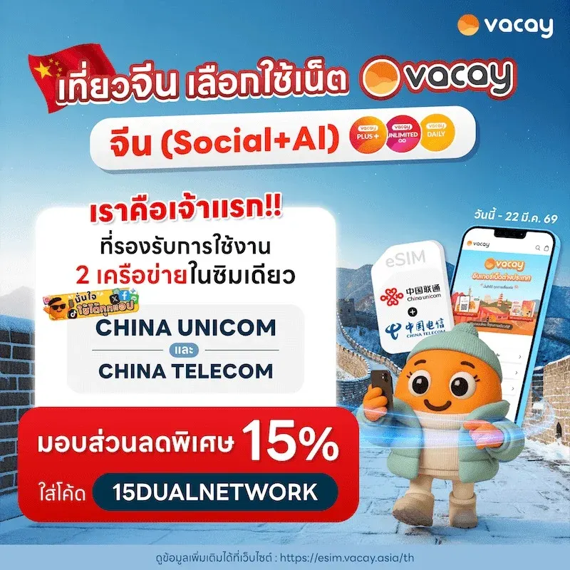 ด้วยแนวคิดนี้ Vacay จึงพัฒนา eSIM จีน แพ็กเกจ Social + AI เพื่อยกระดับประสบการณ์อินเทอร์เน็ตระหว่างเดินทาง โดยรองรับการเชื่อมต่อ 2 เครือข่ายหลักของจีนในซิมเดียว ช่วยเพิ่มความเสถียรในการใช้งานอินเทอร์เน็ตระหว่างทริป