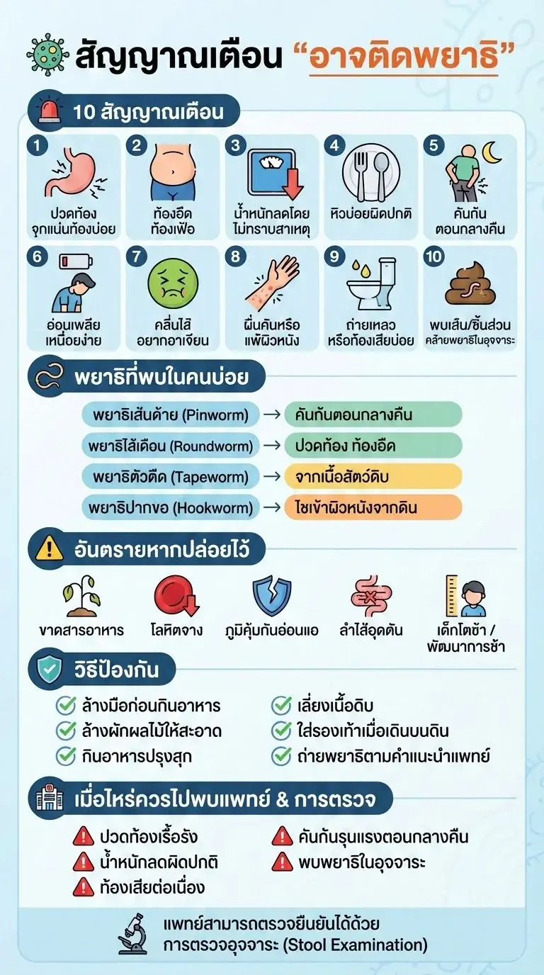 หากมีอาการเหล่านี้หลายข้อร่วมกัน ควรไปพบแพทย์เพื่อตรวจวินิจฉัย เพราะการตรวจอุจจาระสามารถช่วยยืนยันการติดพยาธิได้ และรักษาได้ด้วยยาเฉพาะ