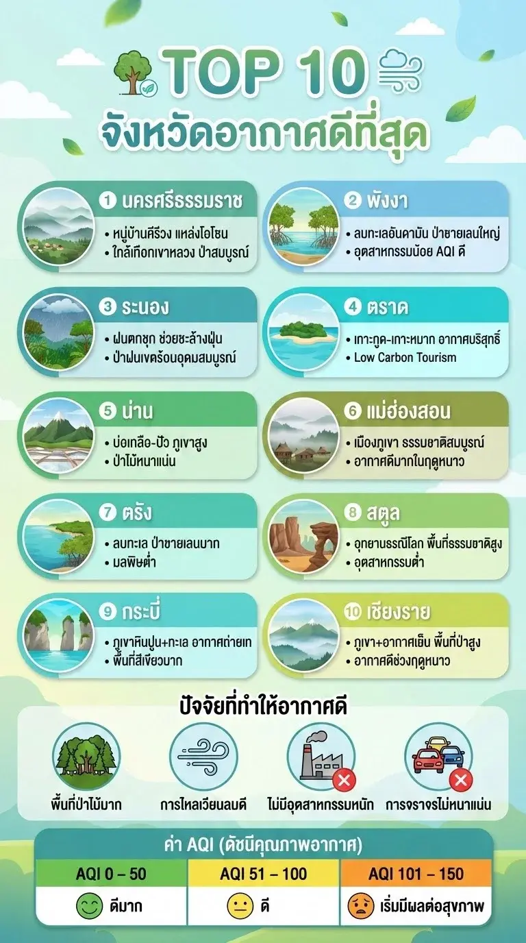 ในยุคที่เมืองใหญ่เต็มไปด้วยควันพิษ การค้นหาจังหวัดที่อากาศสะอาด (Clean Air Destination) จึงกลายเป็นเทรนด์ใหม่ของการเดินทาง นี่คือลิสต์จังหวัดที่อากาศดีที่สุดโดยวัดจาก ค่าเฉลี่ย AQI ต่ำที่สุดตลอดปี และ สภาพภูมิประเทศ ครับ
