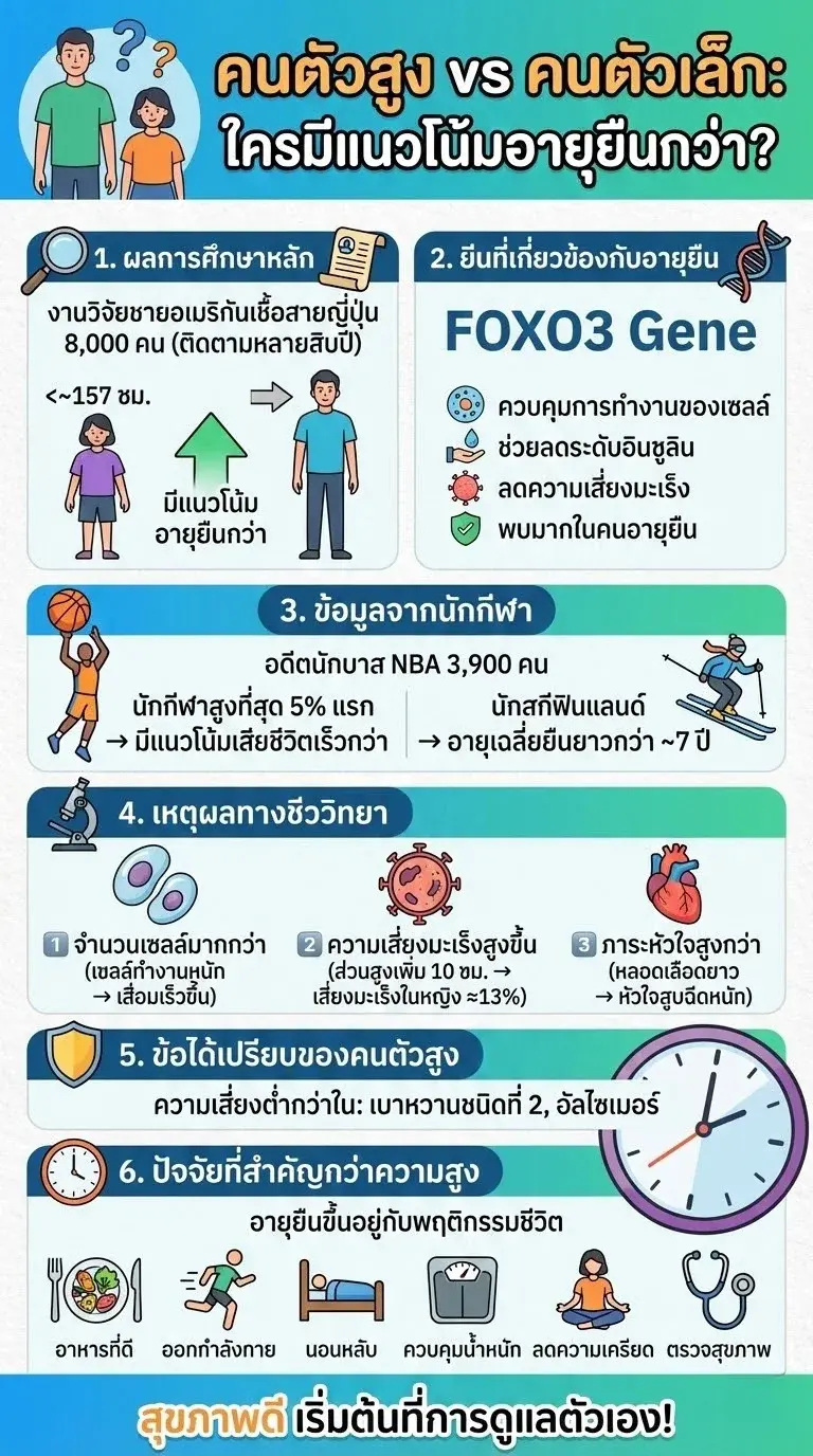 แม้ว่างานวิจัยหลายชิ้นจะชี้ให้เห็นว่า คนตัวเล็กอาจมีแนวโน้มอายุยืนกว่าเล็กน้อย แต่ในวงการวิทยาศาสตร์ยังไม่ได้สรุปว่า “ความสูง” เป็นปัจจัยกำหนดอายุขัยโดยตรง เพราะในความเป็นจริง อายุยืนของมนุษย์เกิดจาก ปัจจัยหลายด้านที่ซับซ้อนมากกว่านั้น