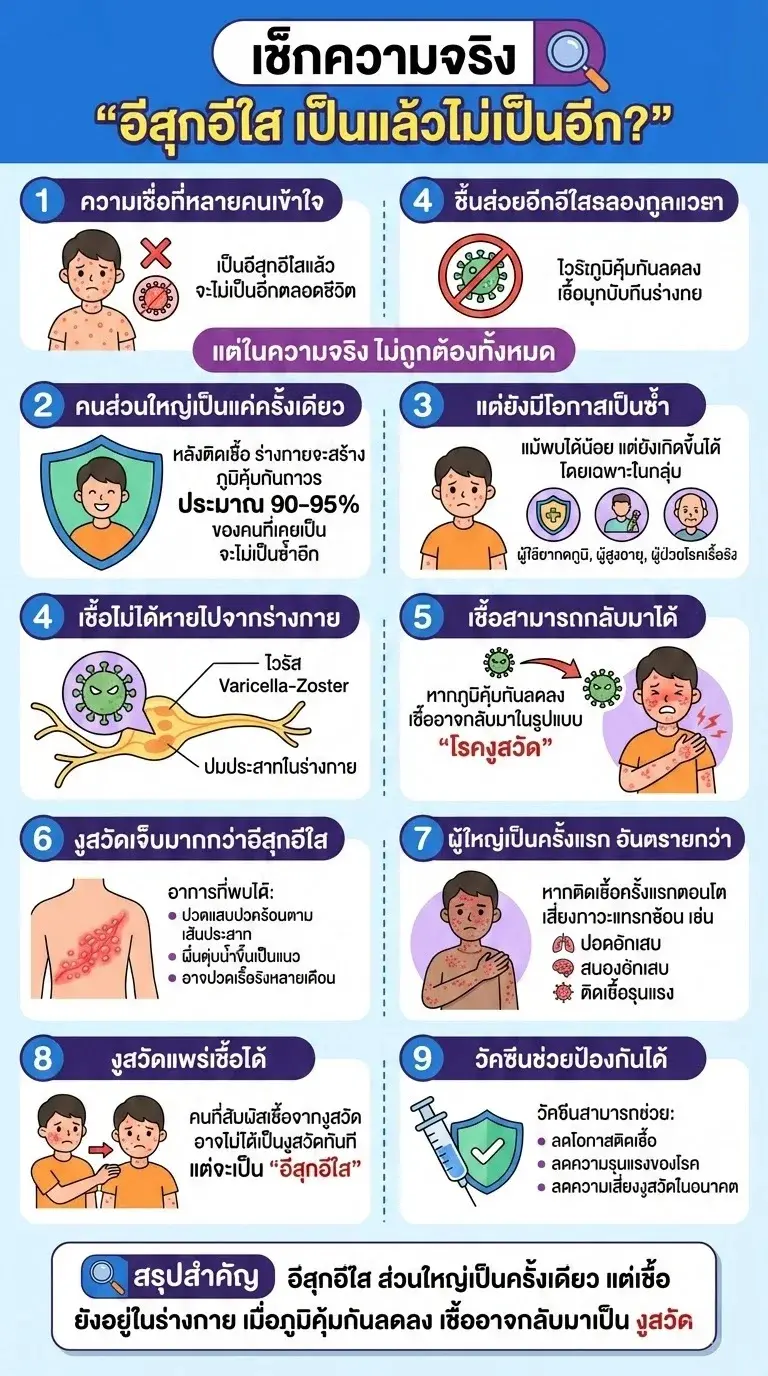 คำกล่าวที่ว่า "เป็นอีสุกอีใสแล้วจะไม่เป็นอีก" จึงเป็นความจริงเพียงส่วนเดียว เพราะแม้ร่างกายจะมีภูมิคุ้มกัน แต่เชื้อยังคงฝังตัวอยู่ในปมประสาทและพร้อมจะเปลี่ยนร่างเป็น "งูสวัด" ได้ทุกเมื่อ การดูแลสุขภาพให้แข็งแรงและเข้ารับการฉีดวัคซีนตามคำแนะนำของแพทย์ จึงเป็นวิธีที่ดีที่สุดในการป้องกันไม่ให้เชื้อไวรัสตัวเดิมกลับมาทำร้ายเราได้อีกในอนาคต