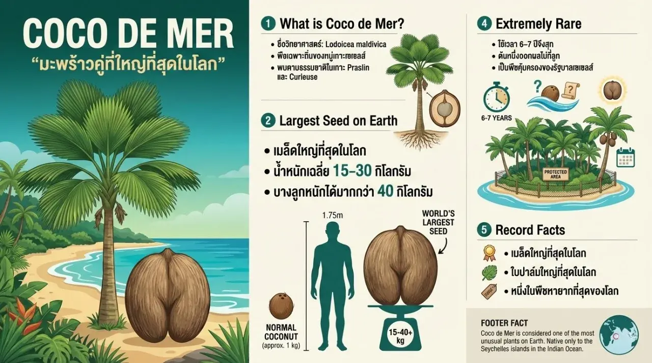 เปิดตำนาน "มะพร้าวคู่" พันธุ์ไม้มหัศจรรย์แห่งมหาสมุทรอินเดียที่ครองสถิติเมล็ดใหญ่ที่สุดในโลก ด้วยรูปร่างที่แปลกตาคล้ายอวัยวะเพศหญิงและสถานะพืชใกล้สูญพันธุ์ ทำให้มันกลายเป็นของสะสมล้ำค่าที่มีราคาสูงถึงหลักหมื่นบาทต่อผล พร้อมกลยุทธ์การเอาตัวรอดที่นักวิทยาศาสตร์ต้องทึ่ง