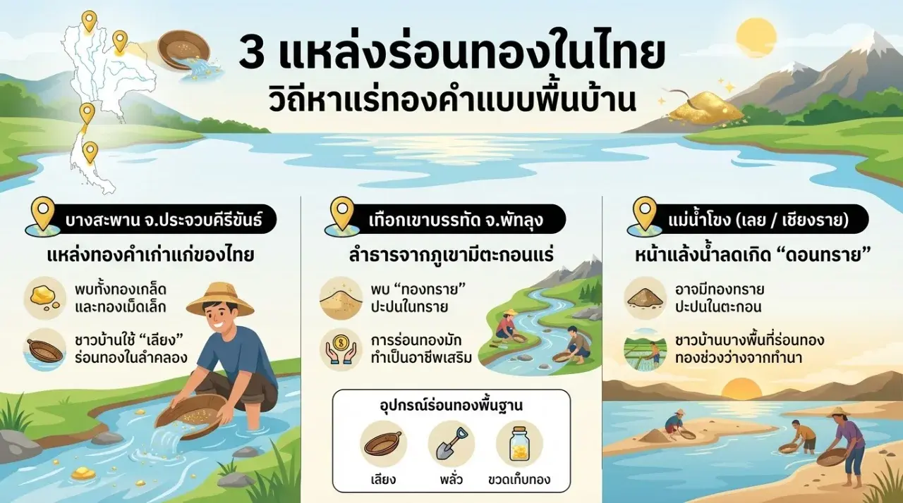 อาชีพร่อนทองในไทยไม่ได้มีแค่ในนิยาย แต่มันคือวิถีชีวิตจริงที่สืบทอดกันมาหลายชั่วอายุคน วันนี้ผมจะพาไปเปิดลายแทงแหล่งร่อนทองชื่อดังที่ใครๆ ก็ไปลองวิชาได้ครับ