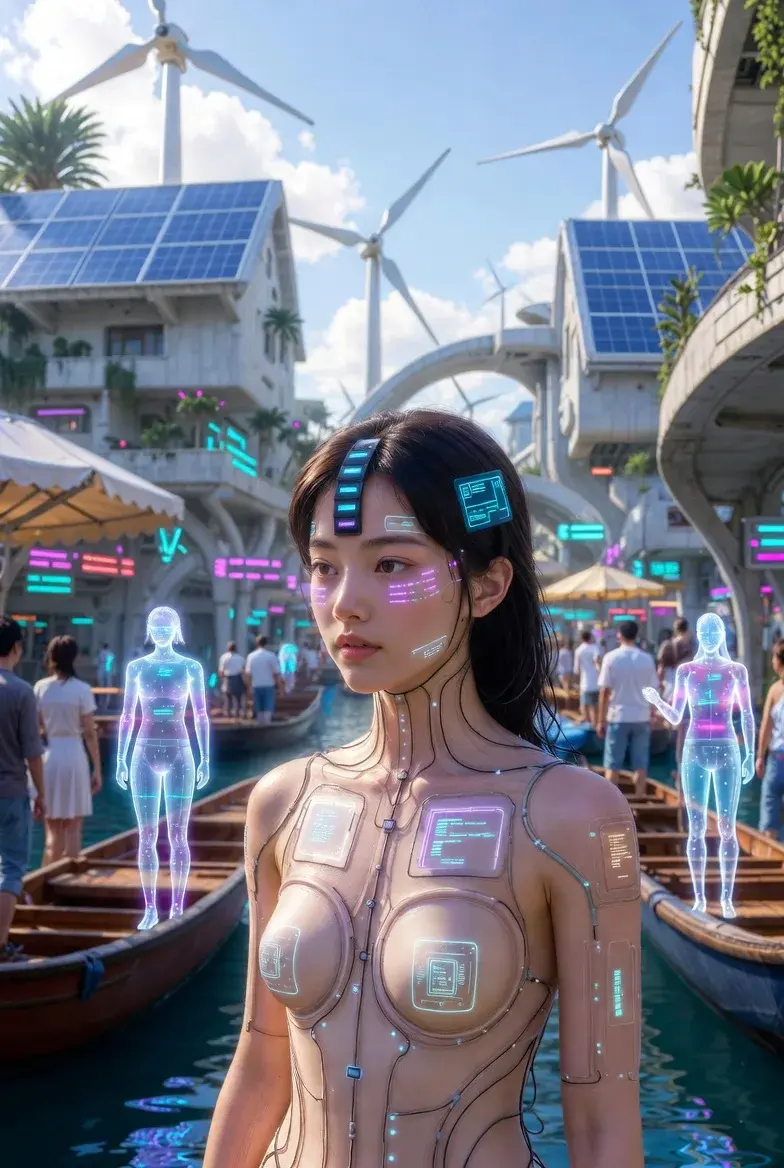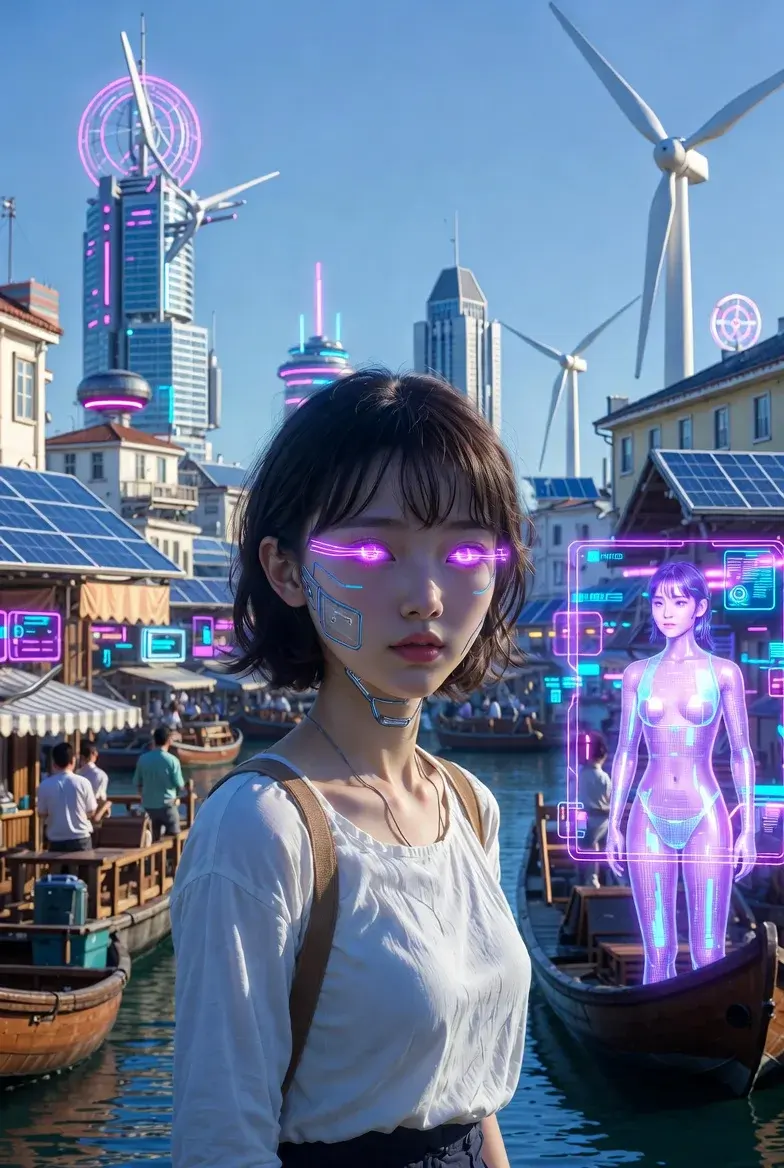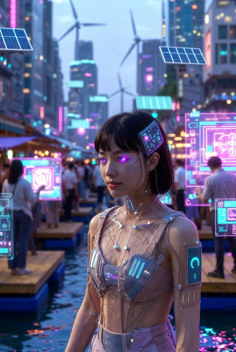 นี่คือเด็กสาวในโลกอนาคตอีก 50 ปี: แสงนีออนจากโฮโลแกรมส่องประกายในดวงตาของเธอ ขณะที่เธอเดินผ่านเมืองที่เต็มไปด้วยเทคโนโลยีล้ำสมัย